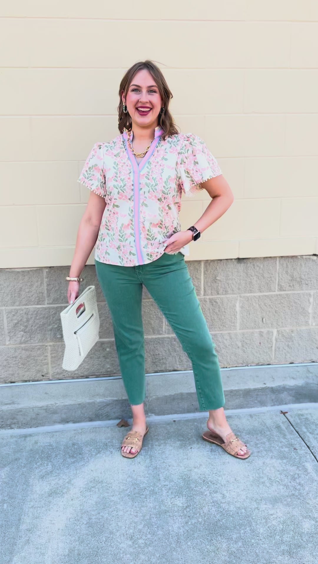 Looking for an easy statement top that instantly brightens your outfit? The Garden Party Contrast Ruffle Top brings playful color and feminine charm together in a way that feels effortlessly polished for spring and summer. Designed with a soft cream background and vibrant pink and green florals, this top feels fresh, cheerful, and perfect for adding a pop of personality to your everyday wardrobe.