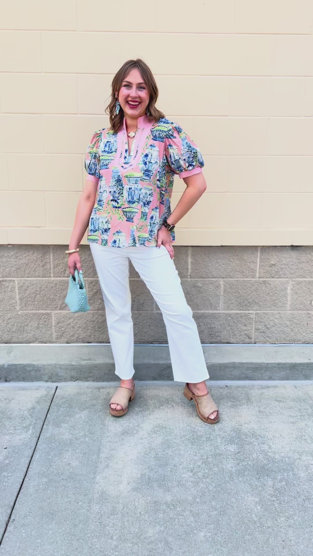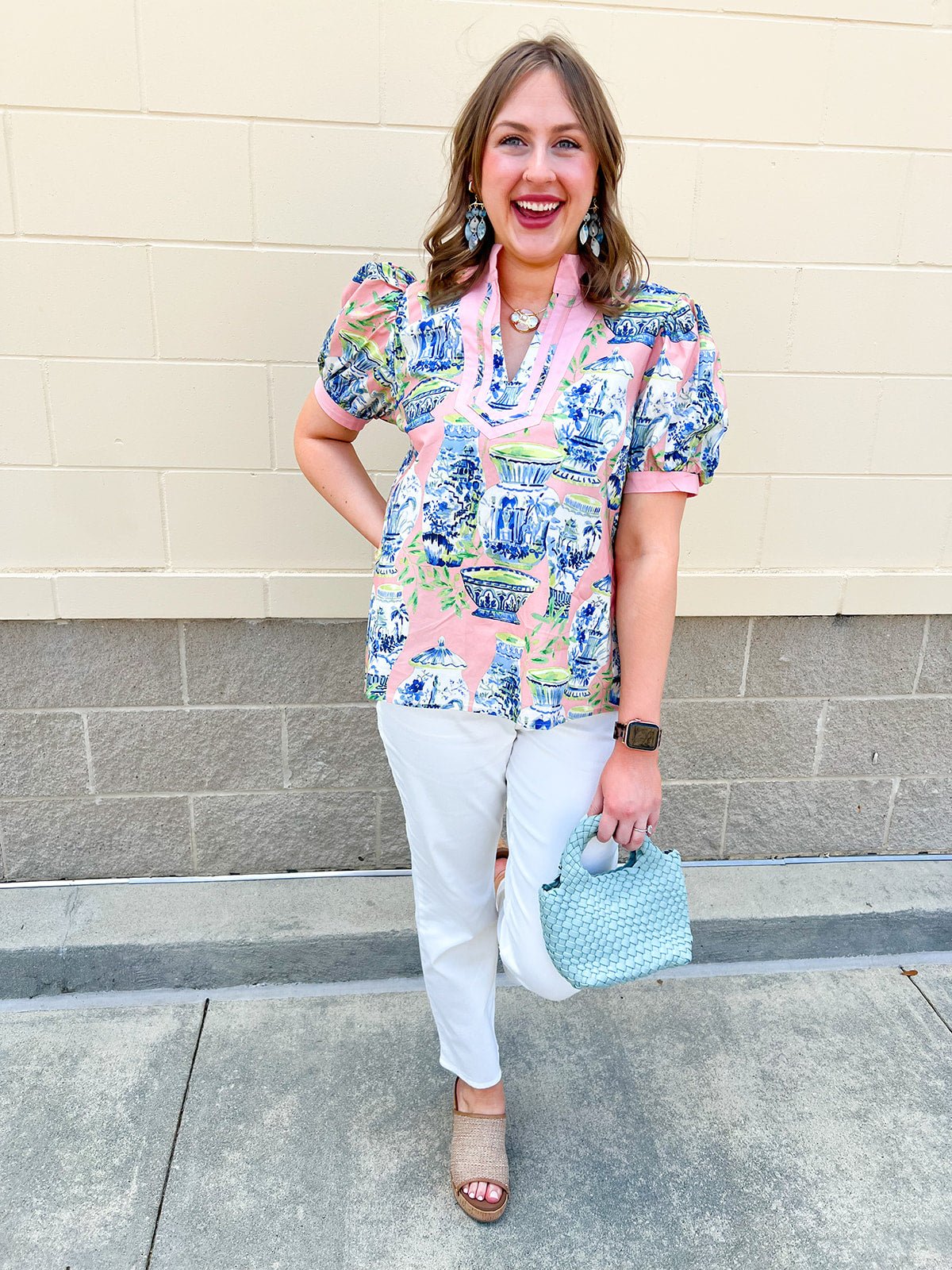 Looking for a top that feels just as elevated as your favorite dress but with everyday ease? The Porcelain Garden Caftan Top brings that same timeless, feminine charm you loved in the dress—now in an effortlessly wearable silhouette. Designed with a soft light pink base and adorned with blue and white chinoiserie-inspired vase prints, this top feels both classic and fresh, with subtle pops of green adding a lively, seasonal touch.