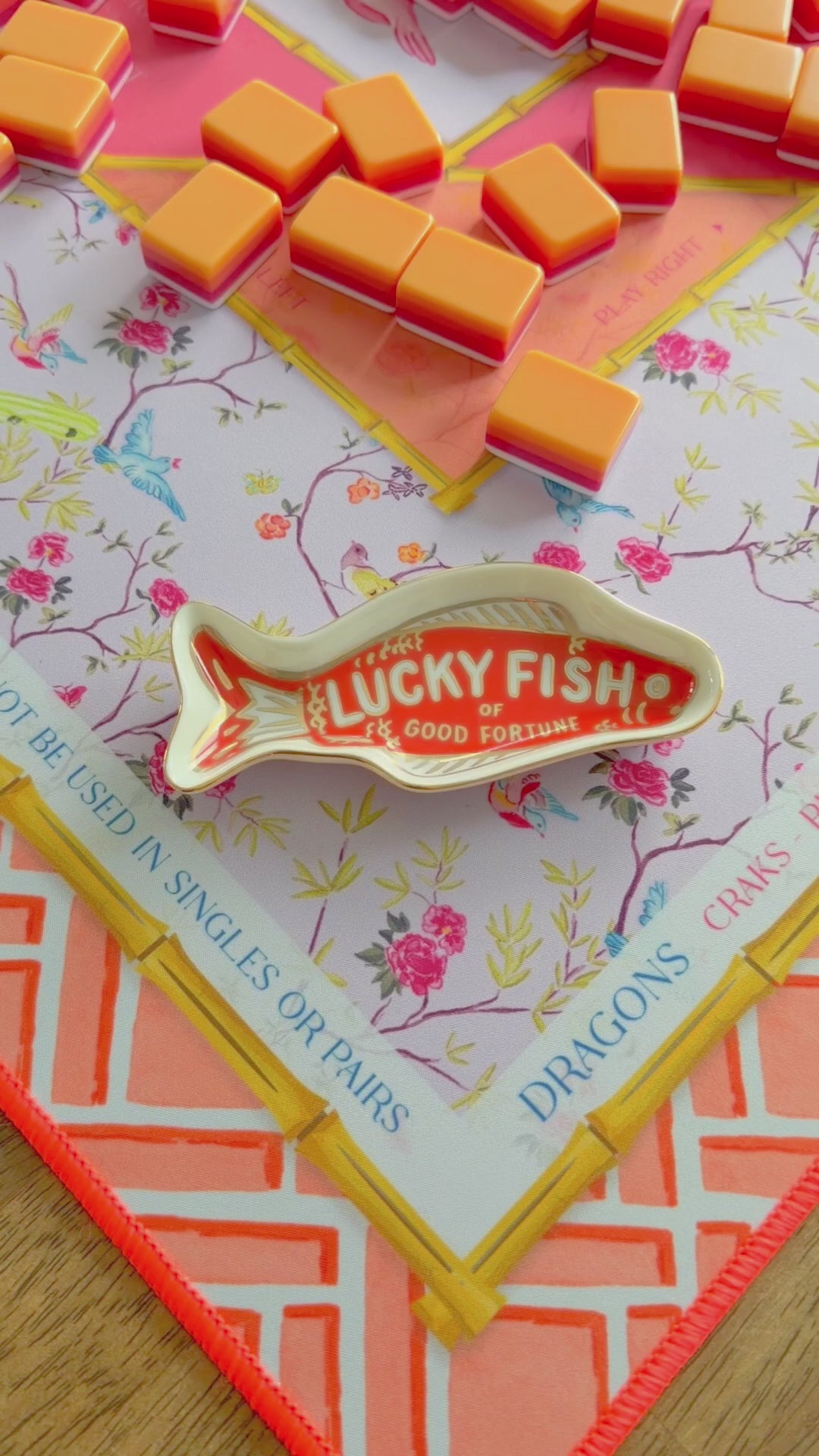 Lucky Fish Dice Catchall is the sweetest little statement piece for your Mahjong table. Shaped like a vibrant coral-red fish and trimmed in delicate 10k gold detailing, this charming catchall brings a playful pop of color and a touch of symbolism to every game night. With “Lucky Fish of Good Fortune” scripted across the center, it’s more than décor, it’s a wink of whimsy and a nod to prosperity at the table.
