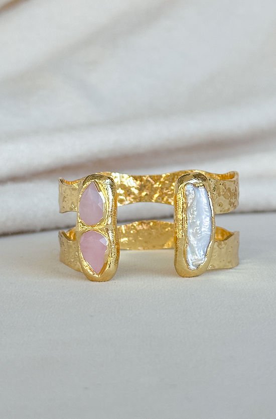 Transform your wardrobe with the stunning Easton Elle Double Cuff with a pink stone and freshwater pearl. Made from premium metal and showcasing our beloved double cuff style, this accessory will elevate any ensemble. The timeless double pearl details add a touch of luxury, making it a must-have for your jewelry collection. Don't miss out on the durability and style this piece offers - order now!