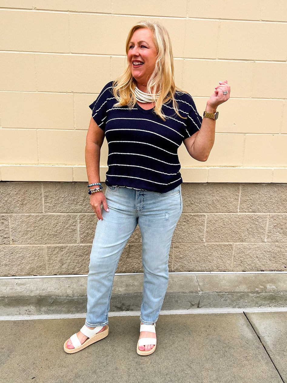 The perfect blend of vintage-inspired style and modern comfort, the Rachael High Rise Mom Jeans are a must-have for your everyday wardrobe. Featuring a high-rise fit with a tapered, cropped leg, this pair creates a flattering silhouette that feels effortlessly cool. Subtle distressing adds just the right amount of lived-in character, giving these jeans that perfectly worn-in look without going over the top. Designed with Fab Ab front pockets, they offer a smoothing effect that enhances your natural shape while keeping things comfortable all day long. Easy to dress up or down, these mom jeans are your go-to for laid-back days with a polished twist.