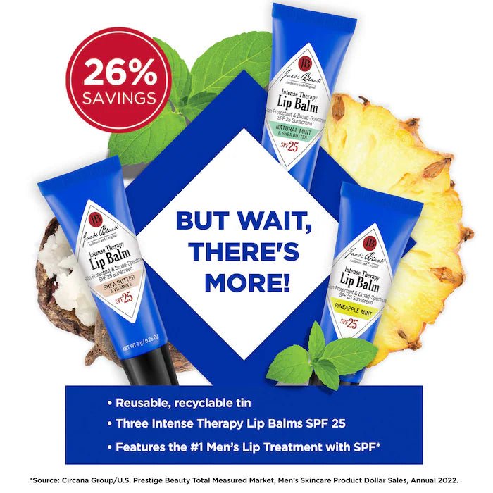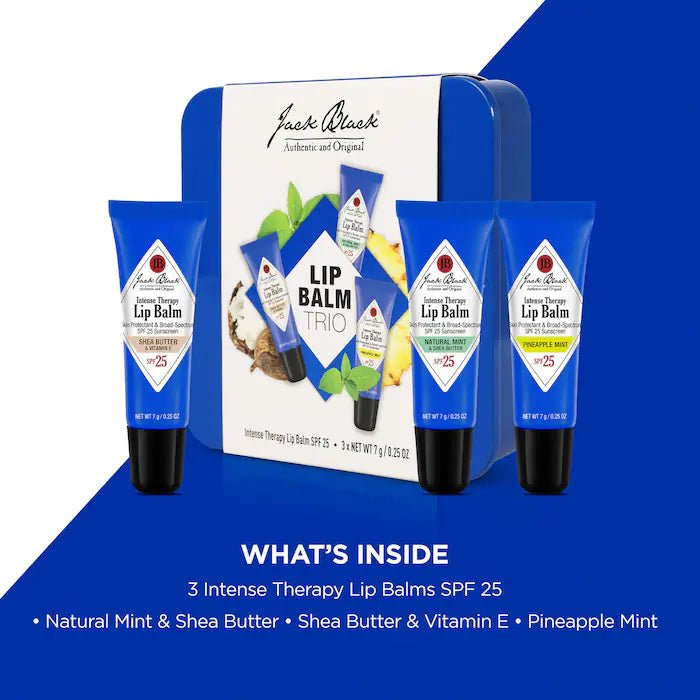 Get ready for softer, healthier lips with our Jack Black Lip Balm Trio. This award-winning set includes 3 Intense Therapy Lip Balms with SPF 25 in popular flavors like Mint and new Pineapple Mint. Packaged in a reusable tin, it's the perfect gift for yourself or a loved one. Say goodbye to dry, cracked lips with this must-have trio, perfect for home, work, and on-the-go. A $30 value!