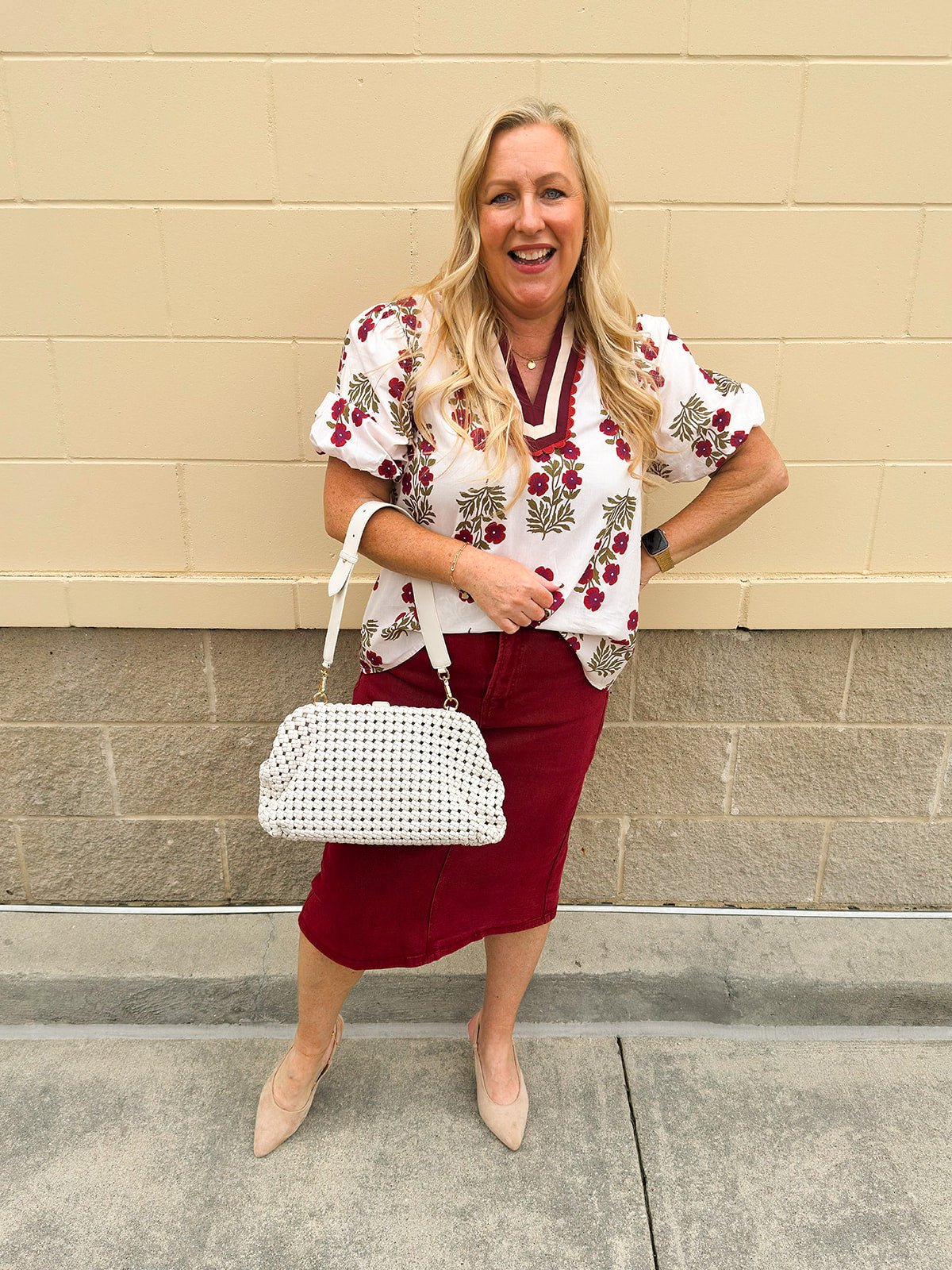 This top features a caftan-style neckline and short puff sleeves, offering a romantic, airy feel while keeping the shape structured and elegant. Crafted from a soft, lined fabric, it showcases a deep red floral pattern on an ecru background, giving it a refined, fresh pop of color. The relaxed fit allows for comfortable movement, making it ideal for both casual and dressier styling.