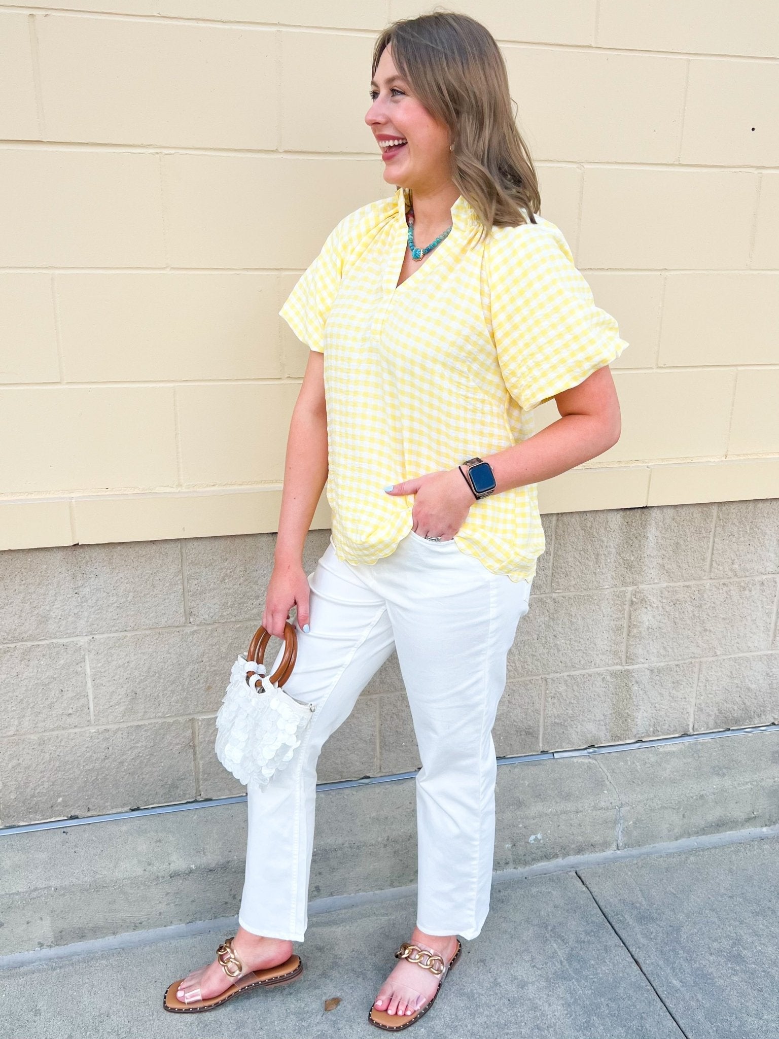 Bright, cheerful, and effortlessly charming—the Golden Picnic Gingham Blouse brings a fresh pop of sunshine to your wardrobe. This lightweight blouse features a classic yellow and white gingham pattern that feels perfectly playful for warm days and easy styling. Delicate ruffle details frame the neckline, while a flattering v-neck adds just the right touch of femininity. The airy fabric keeps things breezy and comfortable, making it a beautiful choice for everything from casual brunches to sunny afternoon strolls.