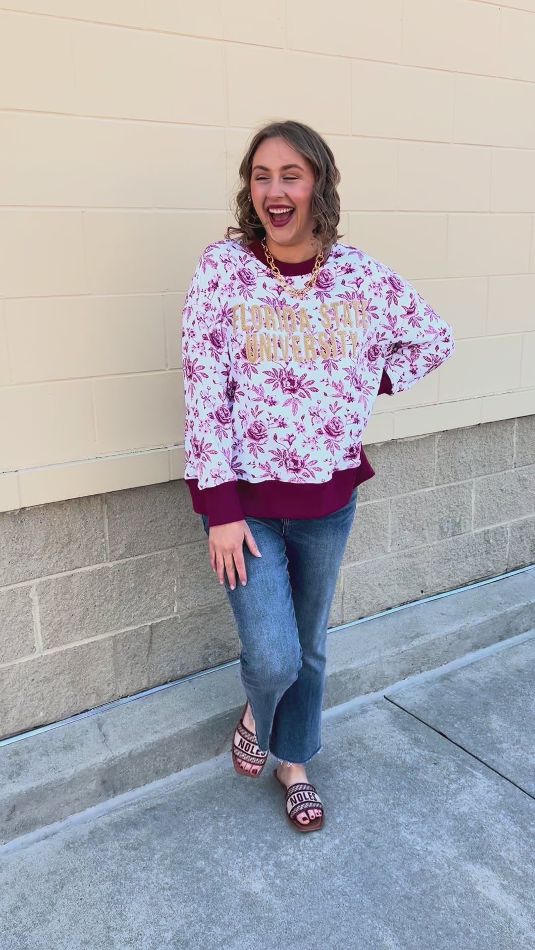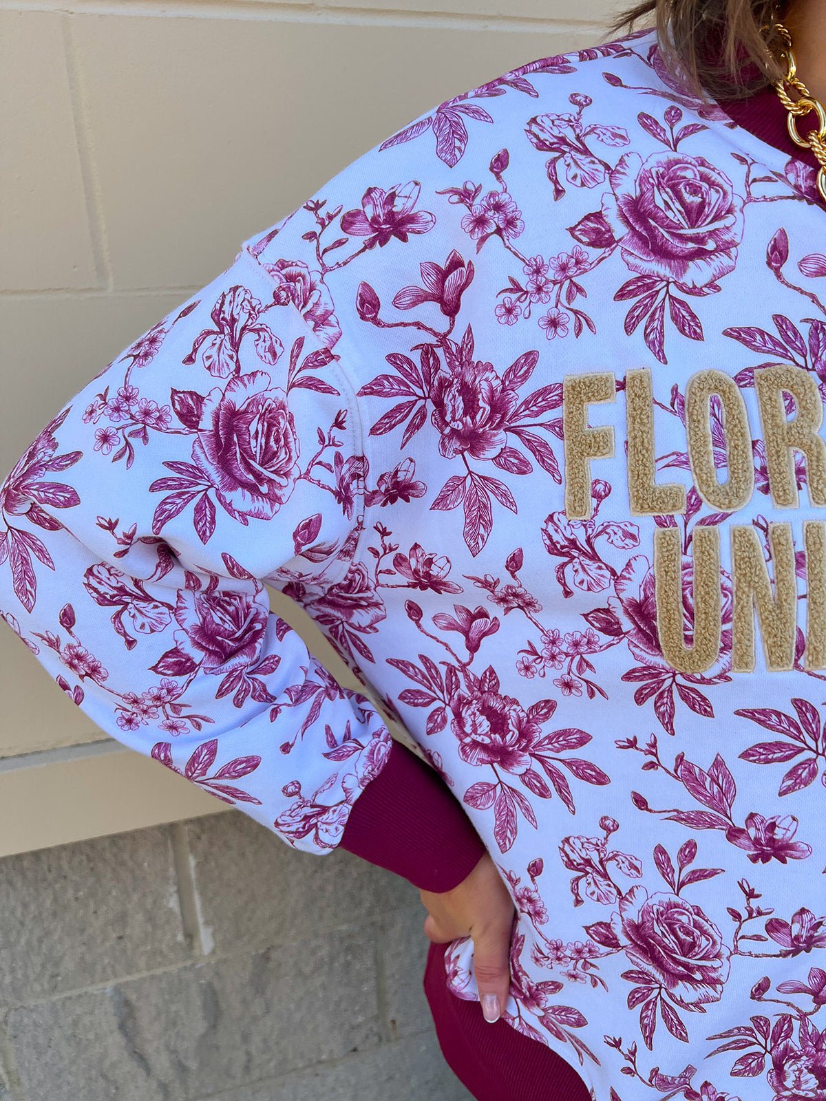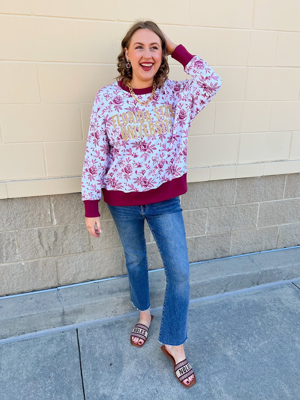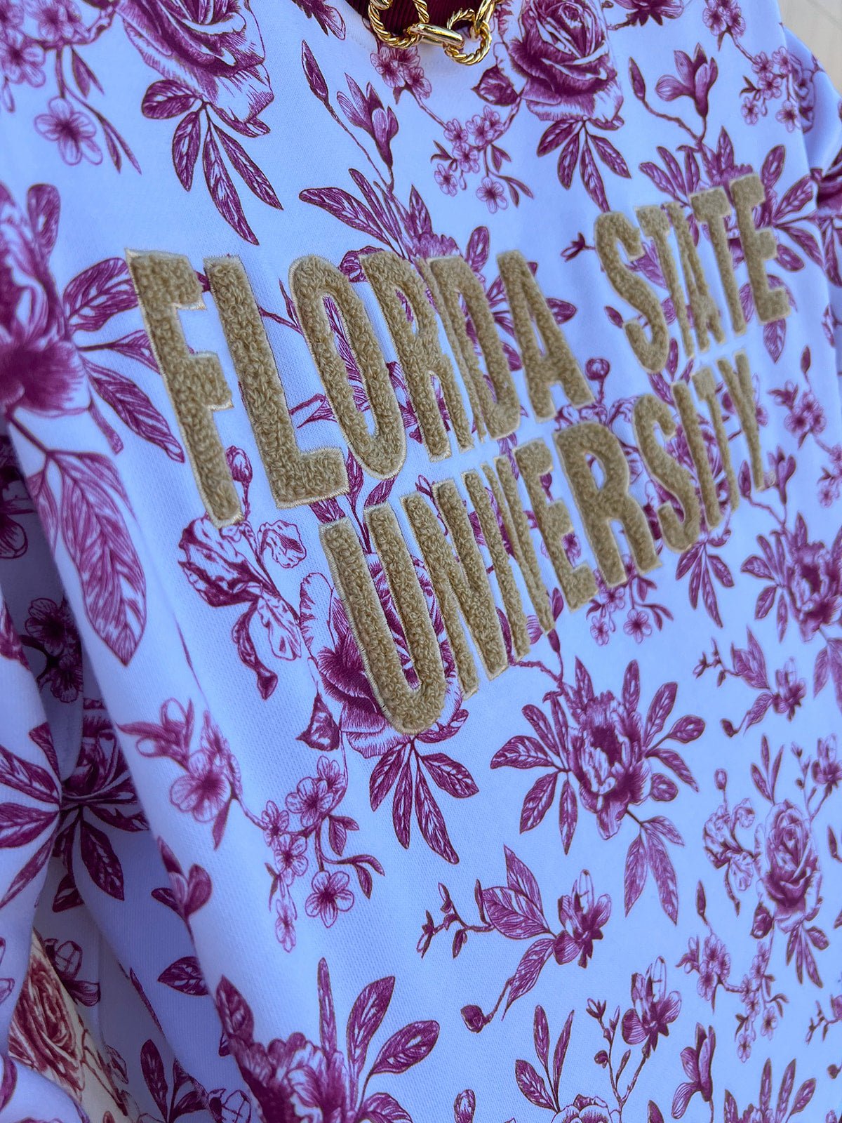 Designed in a garnet and white floral toile print, this crewneck sweatshirt offers a heritage-inspired look that feels both refined and spirited. Across the front, “Florida State University” is spelled out in rich gold chenille patch lettering, adding dimension, texture, and an unmistakable nod to Seminole tradition. Ribbed garnet detailing at the neckline, cuffs, and hemline grounds the look with cozy contrast and a polished finish. The relaxed crewneck silhouette makes it ideal for layering, whether you’re braving a breezy baseball game or styling it casually for everyday wear.