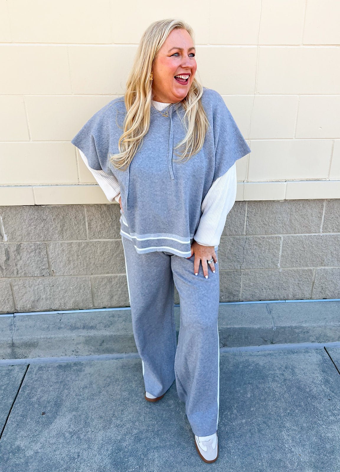 When comfort meets quiet polish, you get the Silver Lining Sweater Lounge Set. This coordinated duo is crafted in a soft gray sweater knit that feels as cozy as your favorite blanket while still looking effortlessly styled. The relaxed short-sleeve hooded top brings an easy, sport-inspired edge with its attached hood and striped hem in white and light gray, perfectly echoing the matching lounge pants for a pulled-together look that feels elevated yet laid-back.
