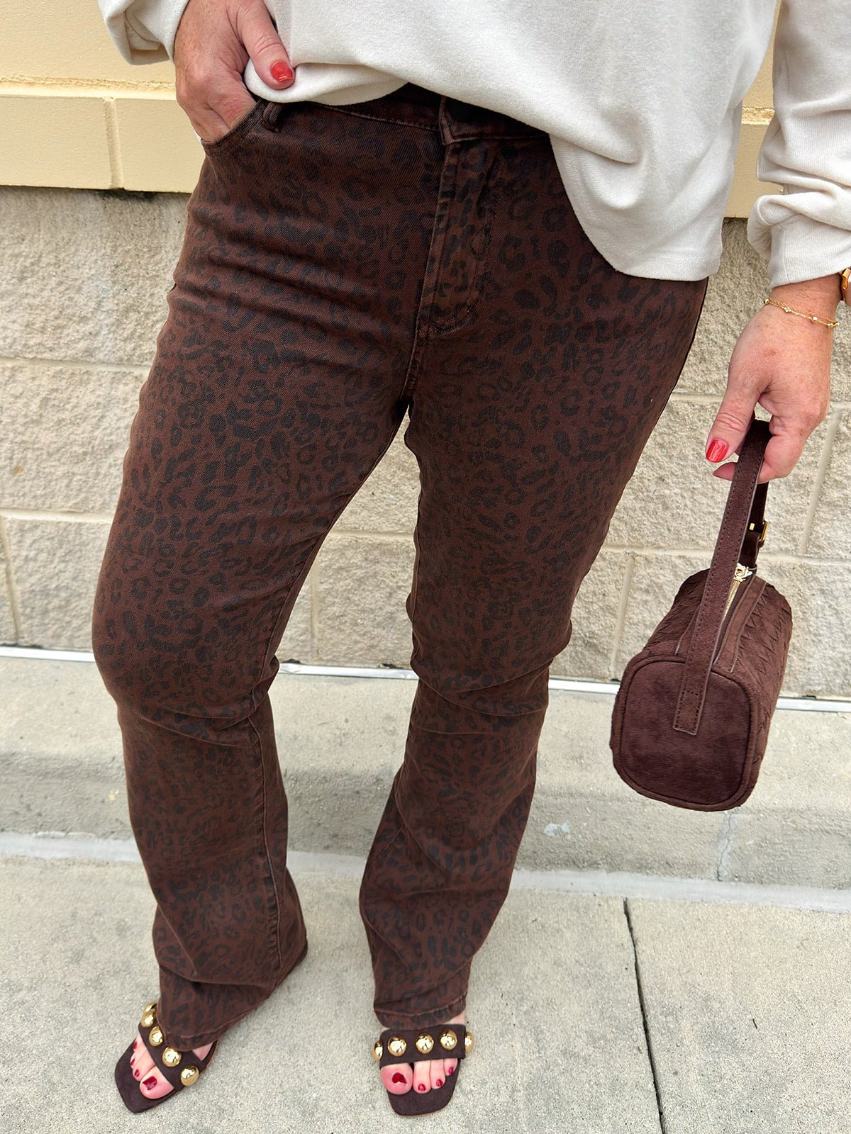 Make a statement this season with the [Dear John] Jaxtyn Leopard Mid Rise Jeans—a fierce yet sophisticated twist on your favorite denim silhouette. Featuring a dark brown leopard mix pattern, these jeans bring a bold touch of personality while staying effortlessly wearable. The mid-rise fit flatters your shape, and the crop-flare leg creates a modern, on-trend silhouette that pairs beautifully with boots, heels, or sneakers. Crafted from a soft cotton and elastane blend, they offer just the right amount of stretch for all-day comfort without losing their structure. With a classic zip fly, button closure, and five-pocket styling, these jeans blend fashion and function in a look that’s equal parts edgy and chic.