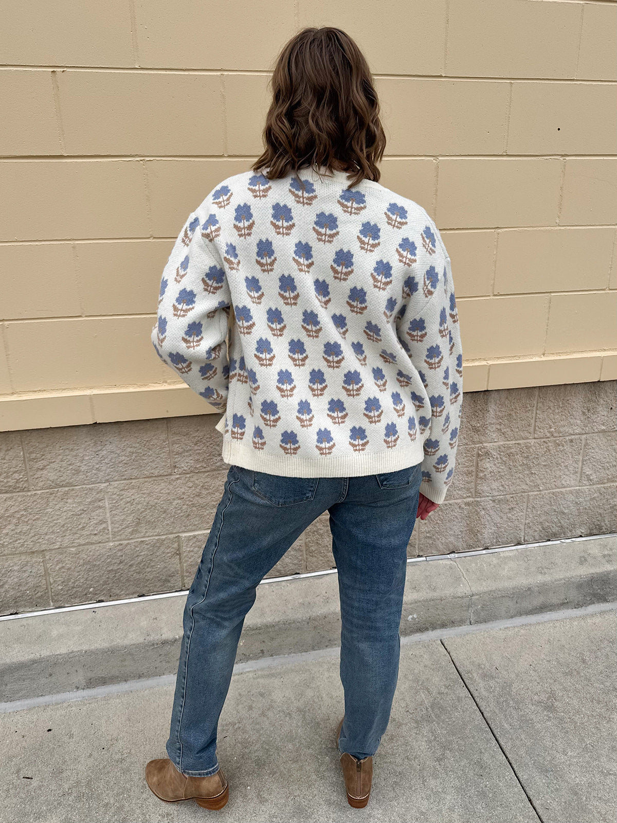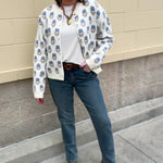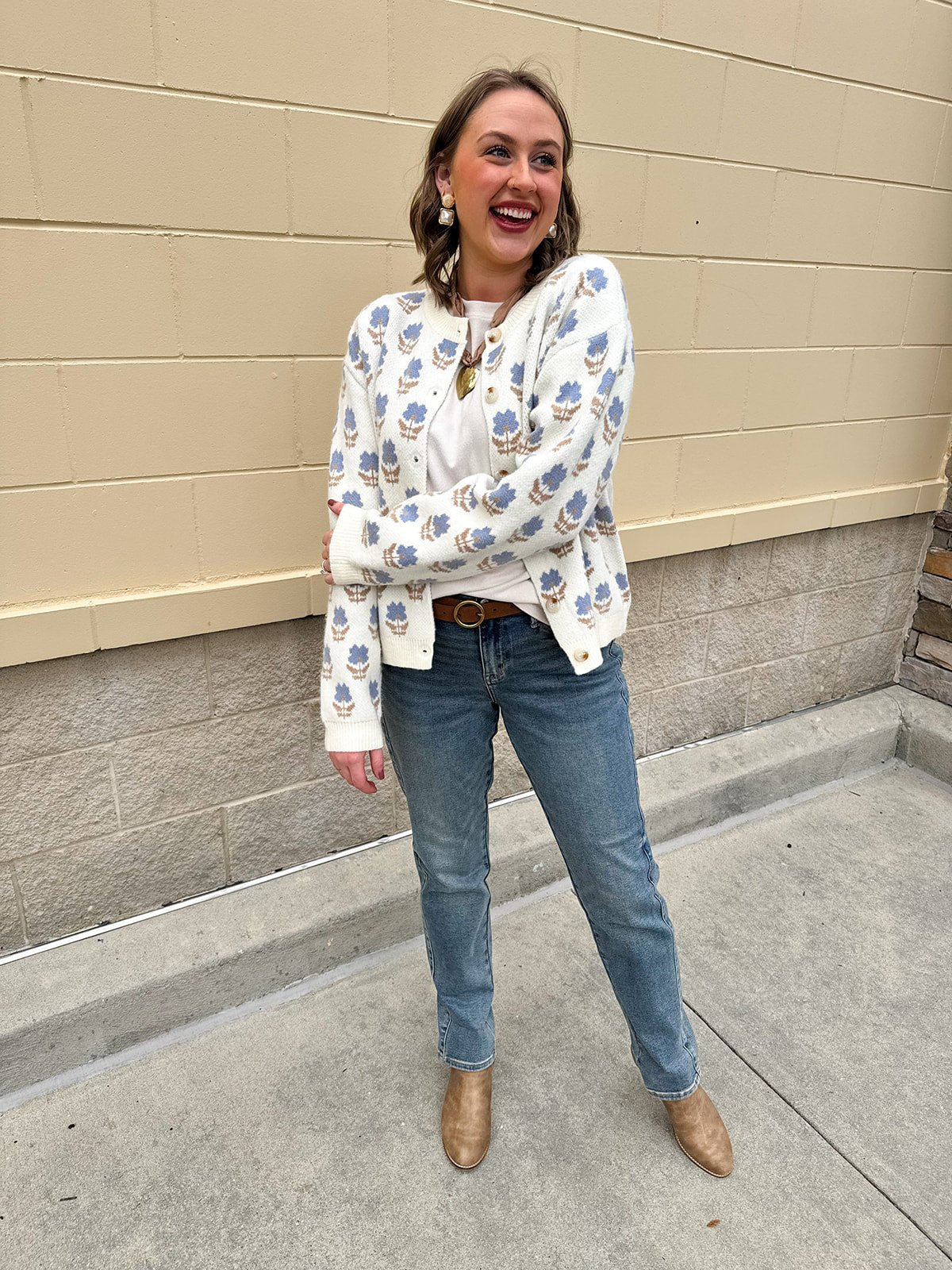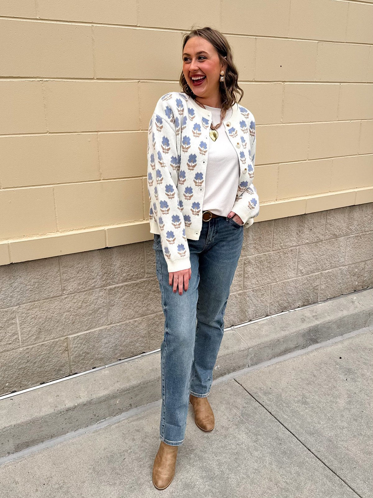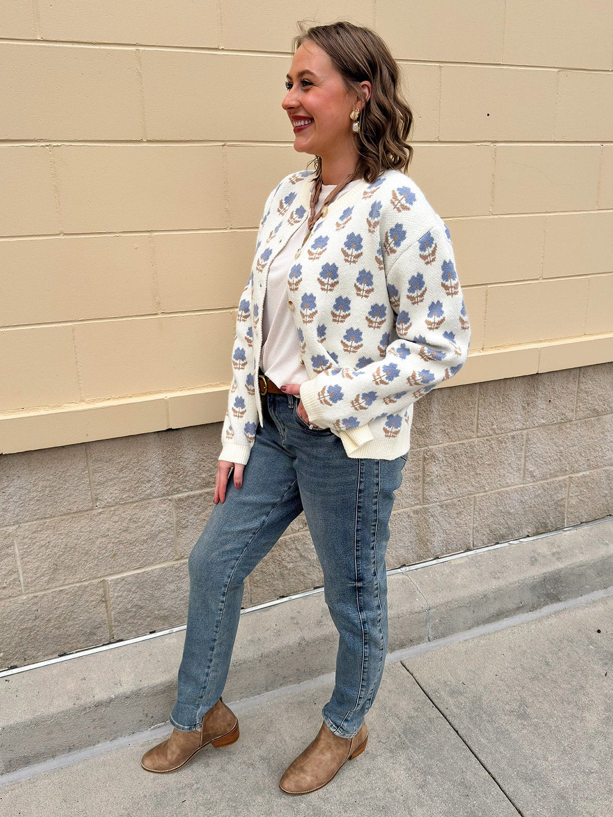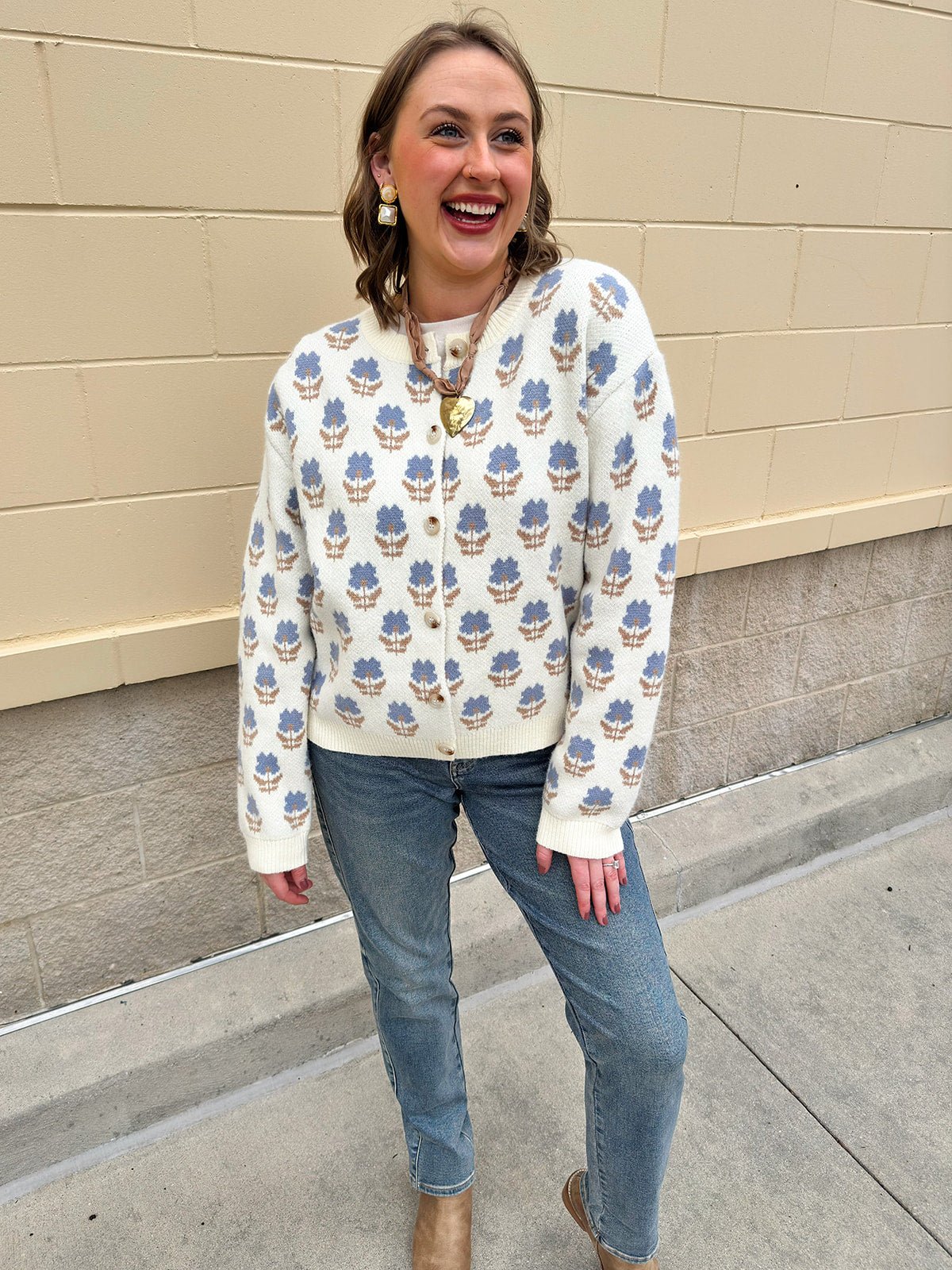 Looking for a lightweight, stylish layer to brighten up your fall wardrobe? The Autumn Bloom Cardigan is the perfect mix of comfort and seasonal charm. Featuring a cream background adorned with delicate blue floral jacquard, this long-sleeve button-up cardigan adds a subtle pop of pattern to any outfit. Its classic crewneck and functional buttons make it versatile for layering or wearing on its own.