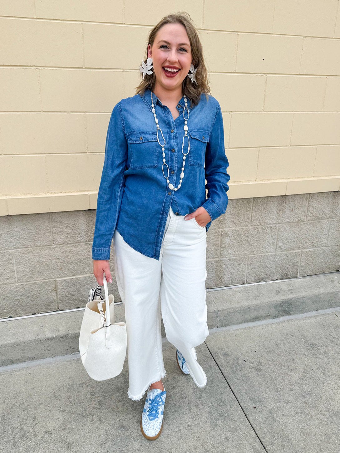 The Autumn Breeze Chambray Button-Down is your go-to layer for those crisp mornings and golden-hour strolls. Made from soft, lightweight denim, this shirt blends classic structure with everyday ease. The button-down front, chest pockets, and relaxed fit offer timeless versatility, while the gentle chambray wash gives it that worn-in, effortlessly cool feel. Whether you're layering it over a dress or tucking it into high-waisted jeans, this piece is a closet essential you'll wear on repeat all season long.