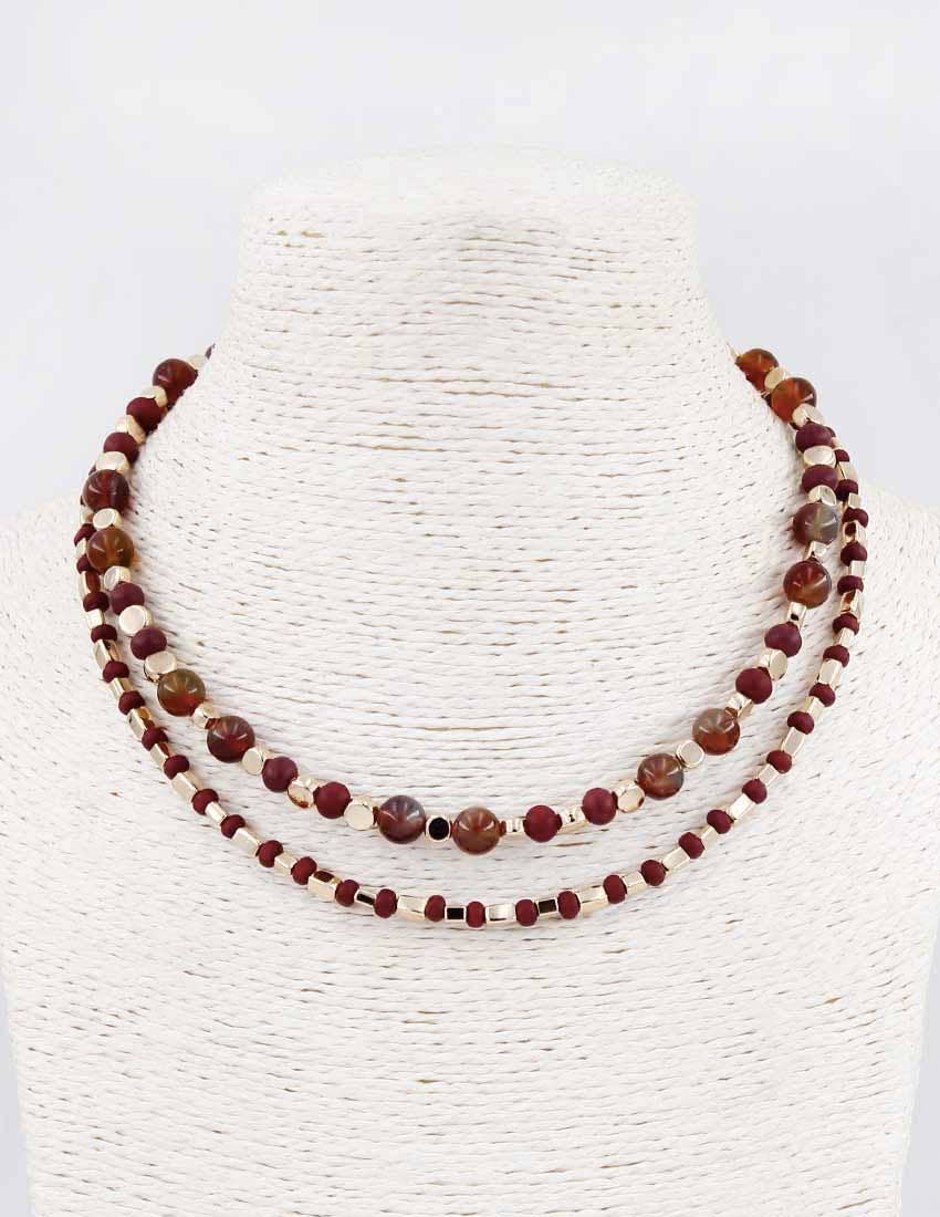 Elevate your fall wardrobe with the Autumn Layered Beaded Necklace. This chic two-layer necklace features alternating deep maroon and garnet beads paired with cream accents, creating a sophisticated and versatile look. One layer showcases larger beads for bold visual impact, while the second layer features smaller beads for delicate detail. The short length makes it perfect for layering or wearing alone as a statement accessory, adding boutique-ready charm to any outfit.