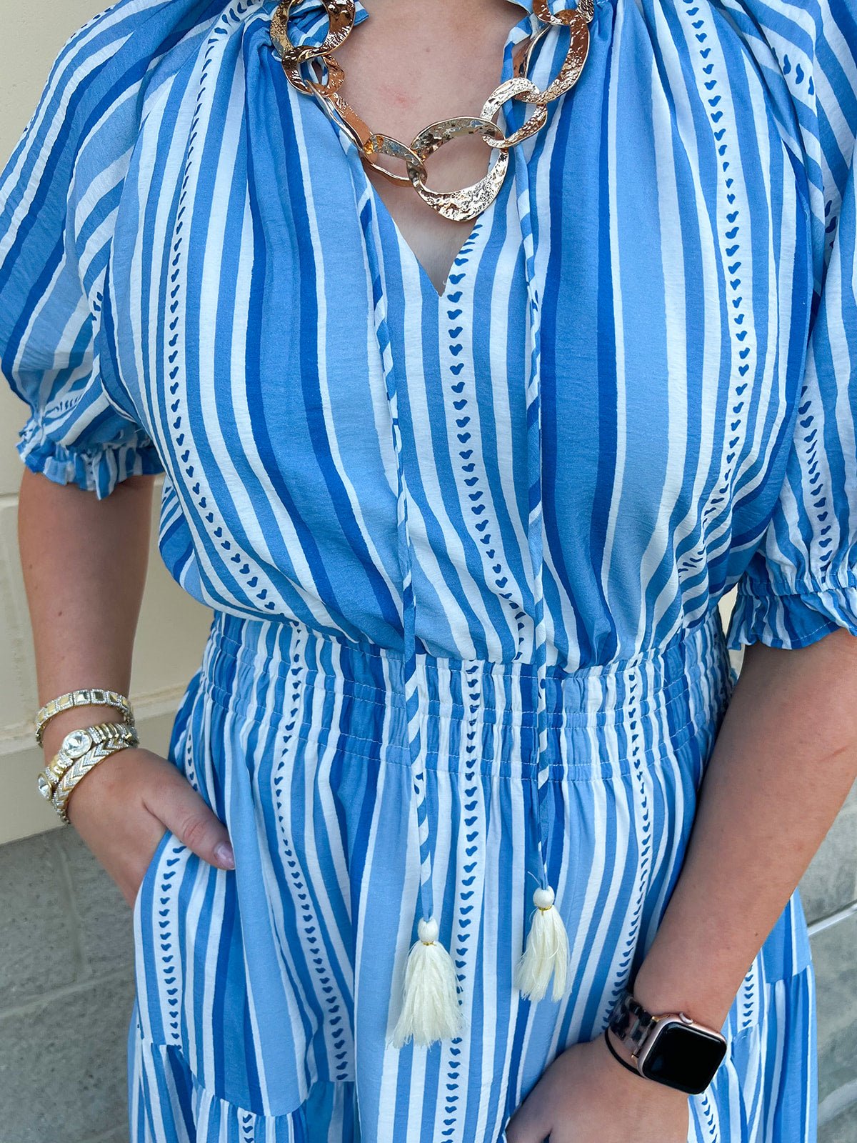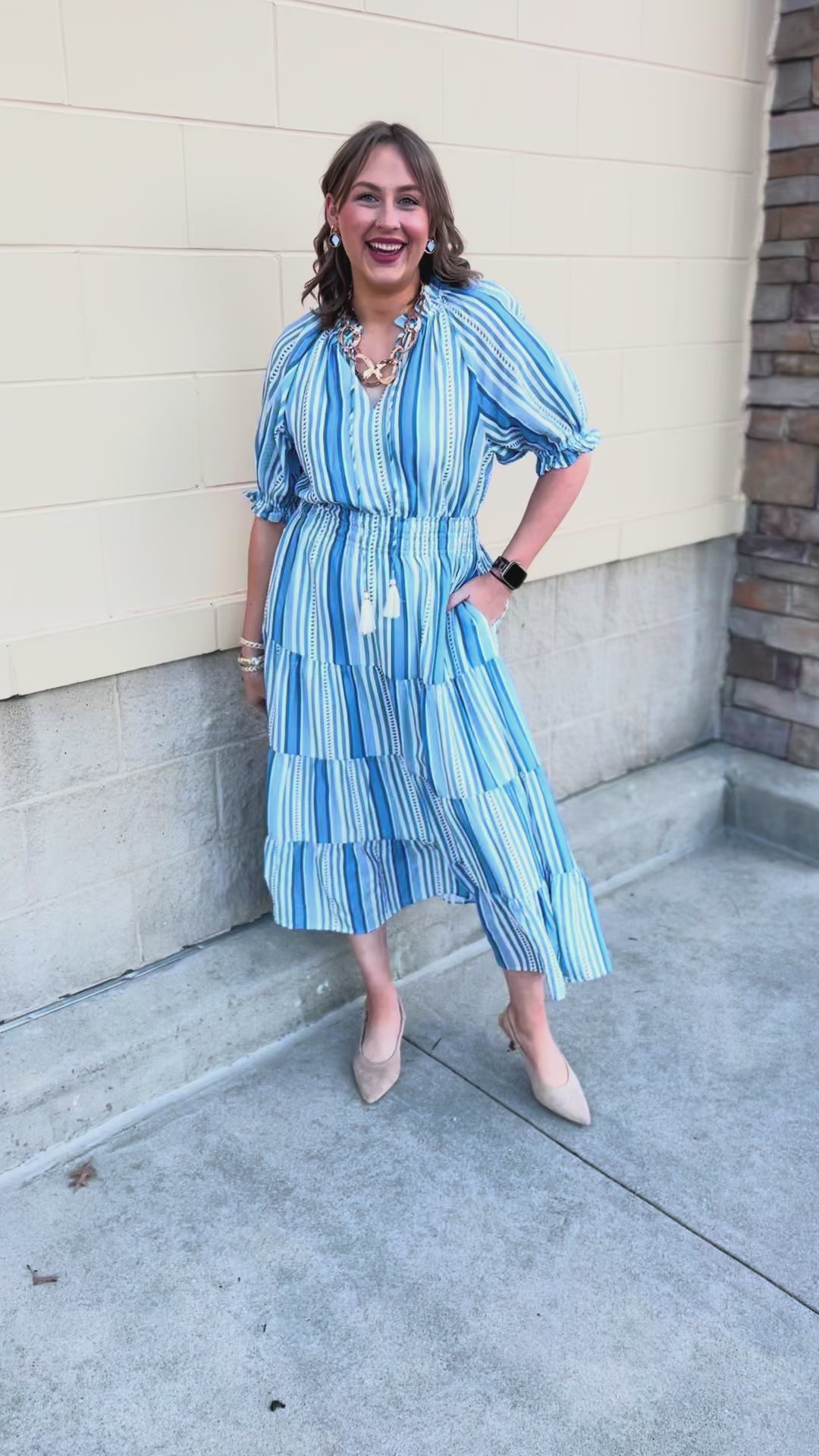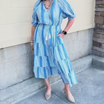 Step into effortless charm with the Azure Whimsy Puff Sleeve Midi Dress. Featuring a flattering tie-neck detail, 3/4 puff sleeves, and a mix of soft blue stripes, this midi dress brings a fresh, playful energy to your wardrobe. Lightweight and breezy, it drapes beautifully for a flattering silhouette while keeping comfort at the forefront. Perfect for brunches, garden parties, or weekend strolls, it’s a versatile piece that feels both classic and contemporary.