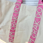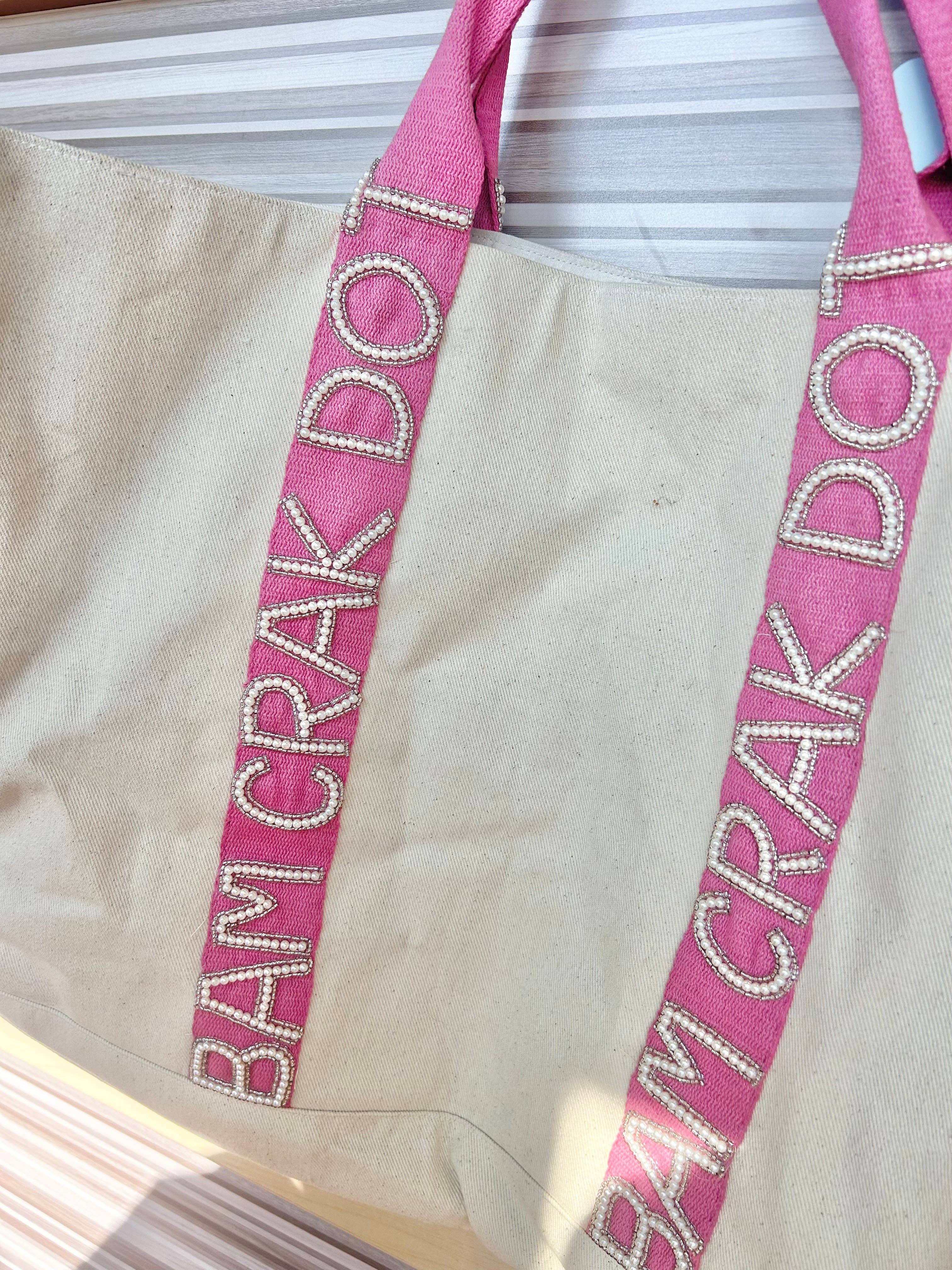 Keep all your mahjong essentials organized in style with the Bam Crak Dot Canvas Tote. Crafted from durable canvas, this spacious tote measures 22" x 15" x 6"—perfect for carrying tiles, snacks, and all your game-night must-haves. Pink canvas straps add a cheerful pop of color, while pearl lettering spelling out BAM CRAK DOT gives it a playful, boutique-inspired touch. Inside, a satin lining keeps your items safe and adds a subtle layer of luxury to your practical tote.