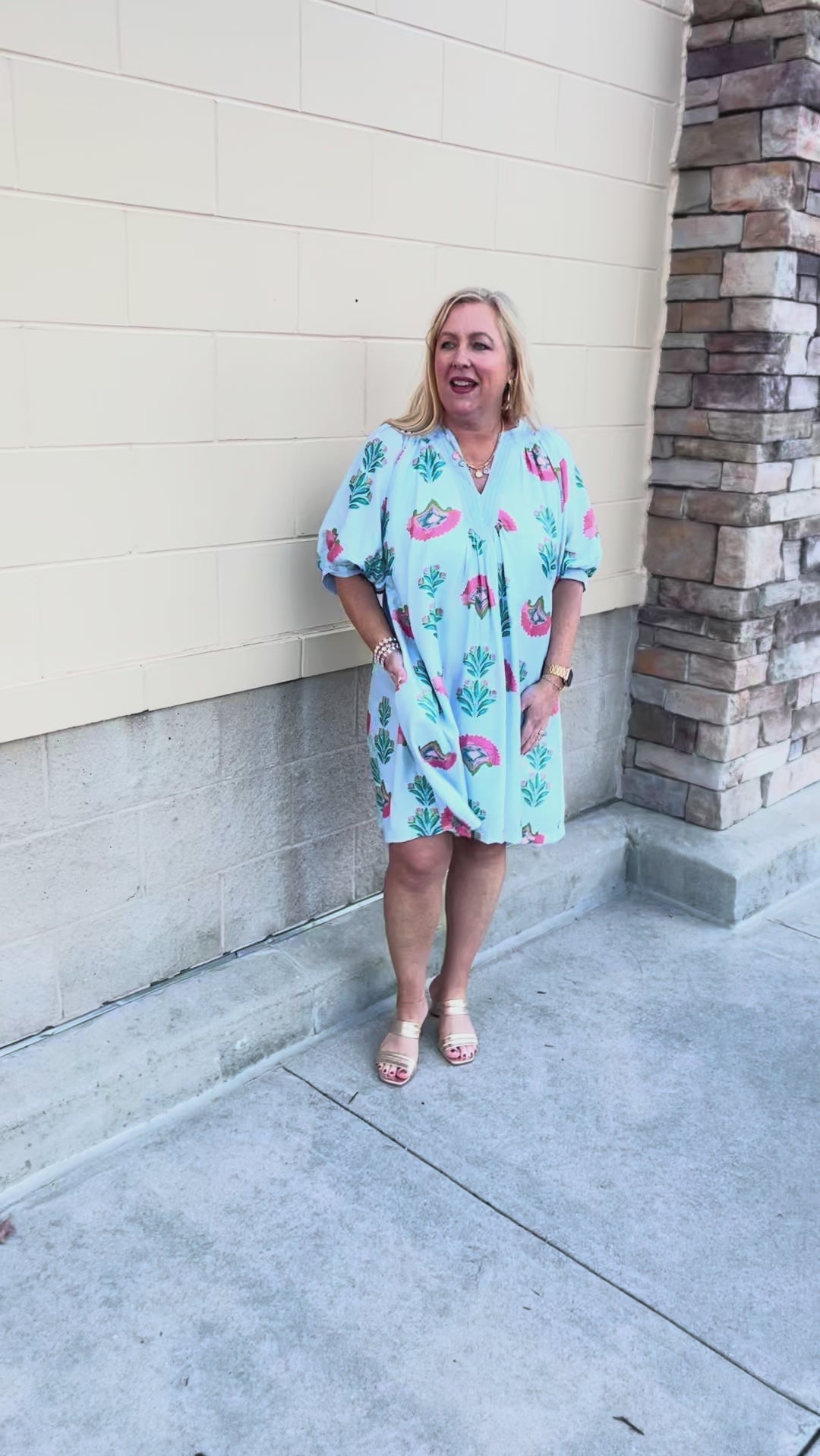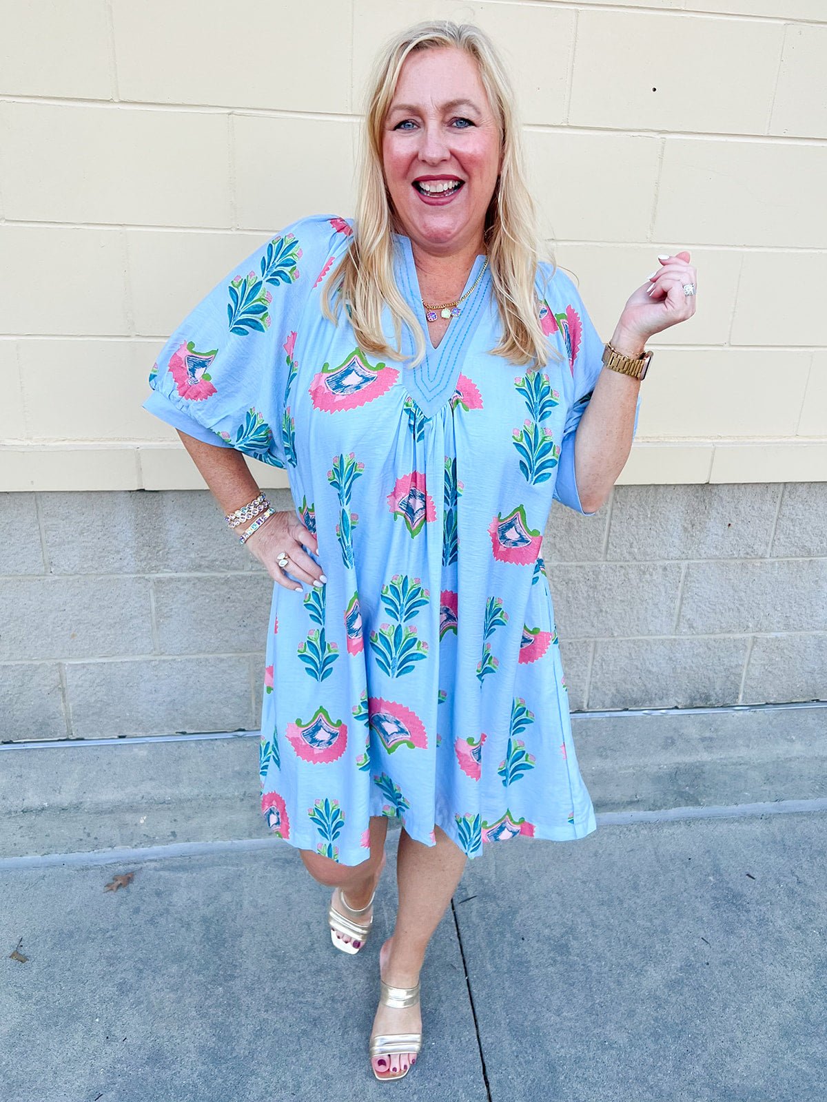 The split V-neckline is accented with delicate stitched detailing, adding texture and that signature boutique finish. Gentle gathers below the neckline create a flattering, flowy drape through the body, while the relaxed short sleeves keep it breezy and comfortable. Lightweight and easy to wear, this dress moves beautifully and feels just as good as it looks.