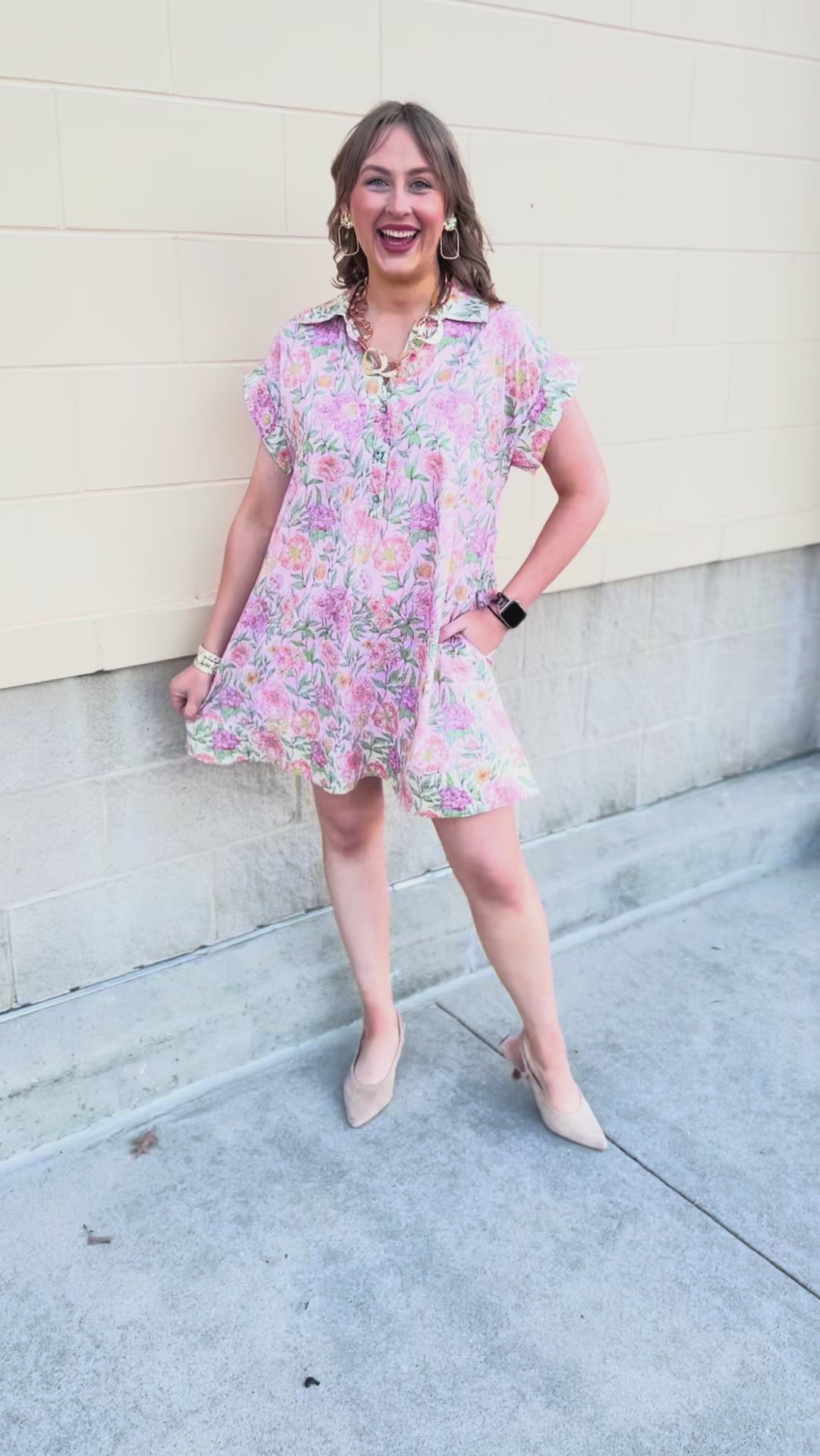 Soft, feminine, and effortlessly polished — this pink floral dress is made for days when you want to feel pretty and put together. Designed in a lightweight woven fabric, it features a delicate floral print that feels fresh, romantic, and perfectly in season.