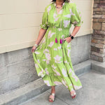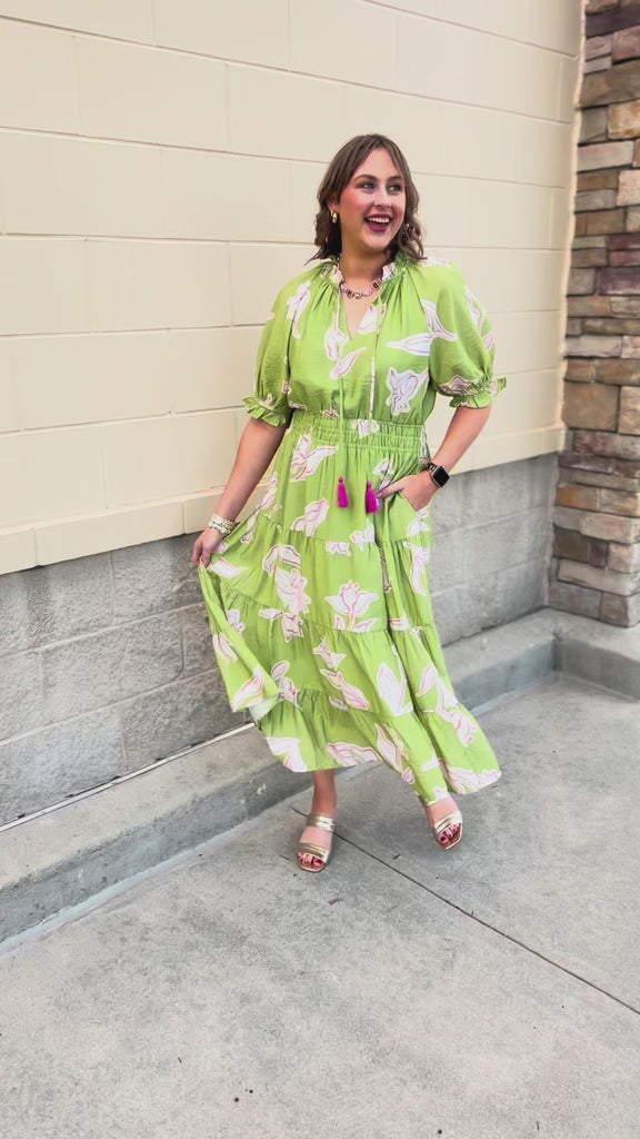 Soft, romantic, and effortlessly chic, the Blushing Meadow Cinch Dress is a springtime must-have. Designed in a fresh green floral print with delicate pink-outlined flowers, this dress features a cinched waist that flatters every figure, puffed sleeves for a touch of drama, and playful drawstring ruffles for subtle movement. The lightweight fabric and flowing silhouette make it comfortable for all-day wear, while the charming details bring a boutique-ready elegance to your wardrobe. Perfect for brunch, garden parties, or a sunny day out, this dress combines femininity and effortless style in one statement piece.