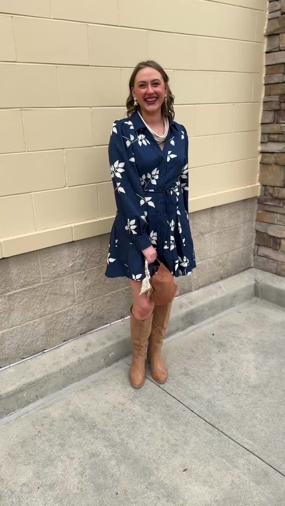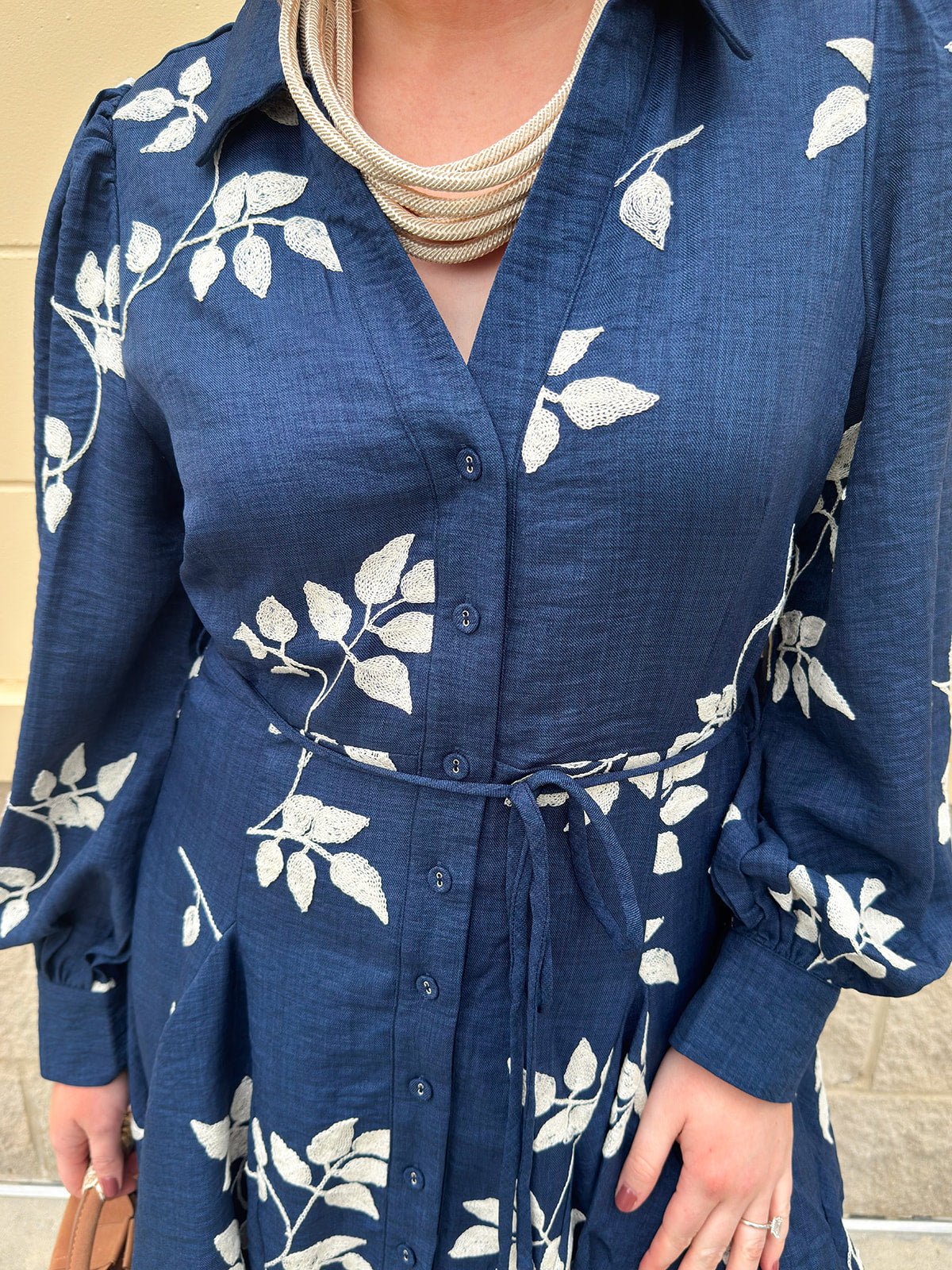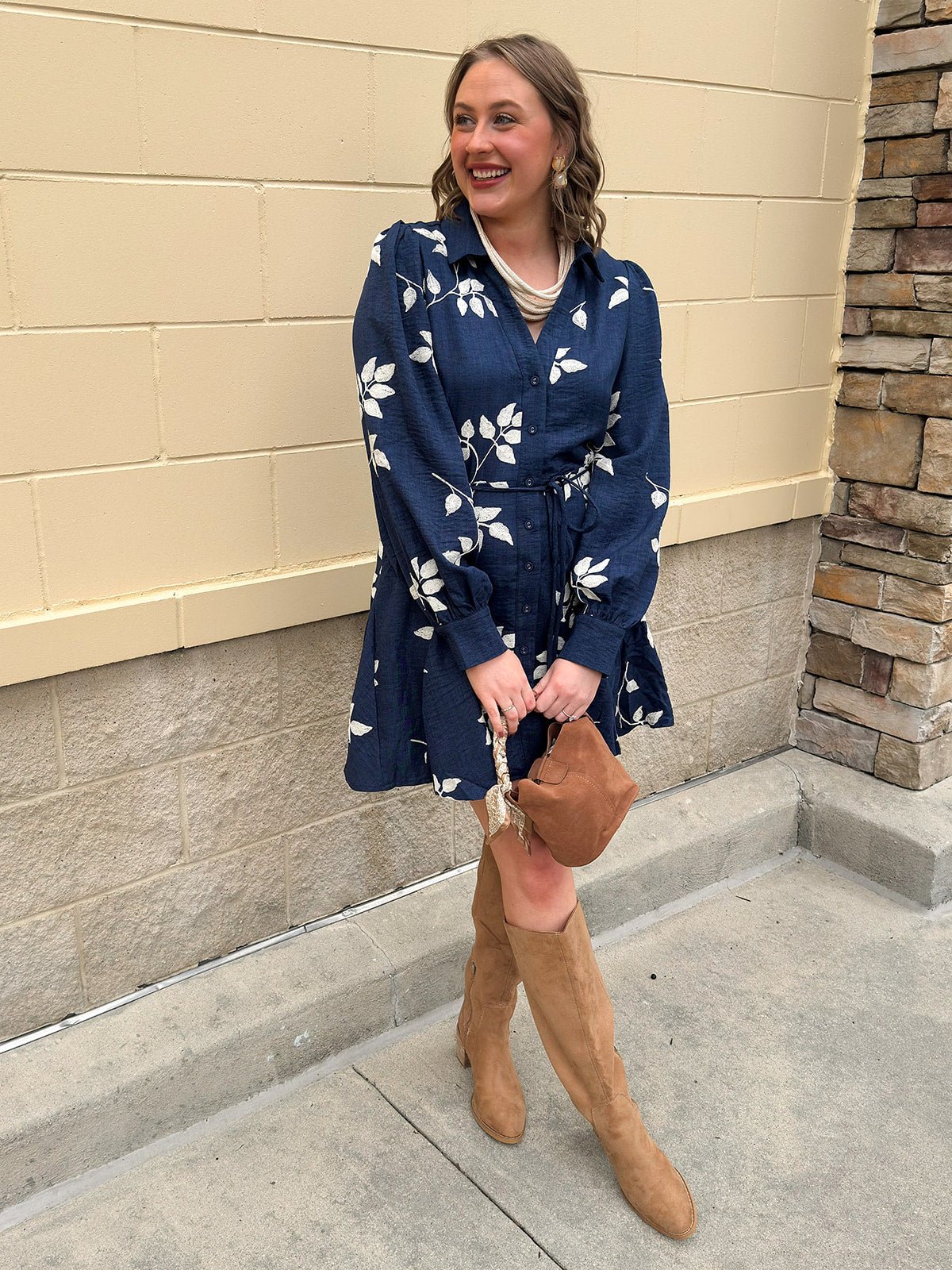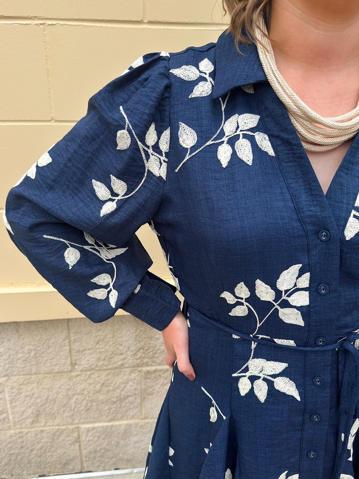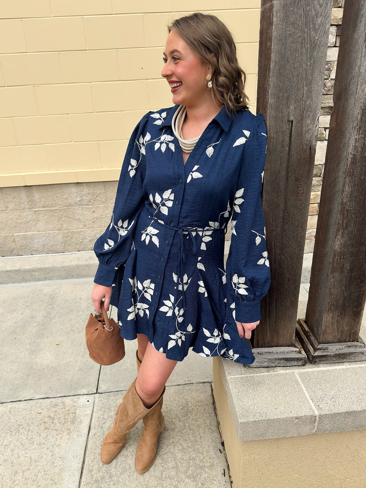 Ready for a dress that feels as cozy as a fall evening by the fire? The Bonfire Nights Embroidered Mini Dress is the definition of effortless autumn charm. Crafted in a deep navy blue hue and detailed with cream floral embroidery, this button-front mini blends timeless design with romantic detail. The collared neckline and adjustable waist tie create a flattering, feminine silhouette, while the long sleeves make it the perfect transitional piece as the weather cools. Both polished and playful, it’s a go-to you’ll reach for all season long.