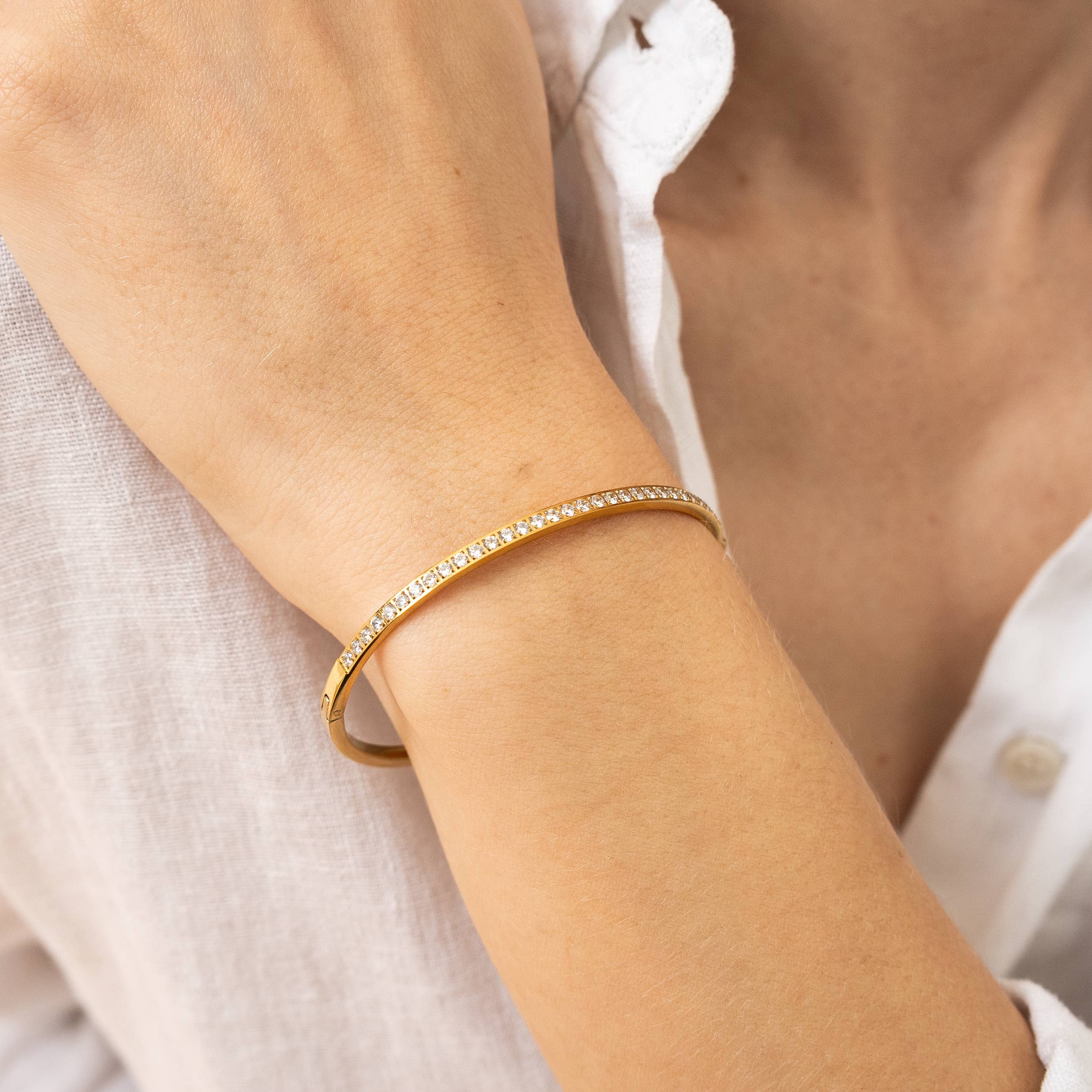 Elevate any outfit with the irresistible sparkle and elegance of the Diamonds Dainty Bangle. Made with the highest quality cubic zirconia crystals, this bangle boasts a sleek and dainty design that shines with every movement. The thick layer of 18k gold ensures durability and waterproofing, making it perfect for any occasion. Inspired by our best-selling combo ring, this bangle offers the same level of charm and glamour, bringing timeless beauty to your wrist. Add some sparkle and sophistication to your everyday look with the Diamonds Dainty Bangle.