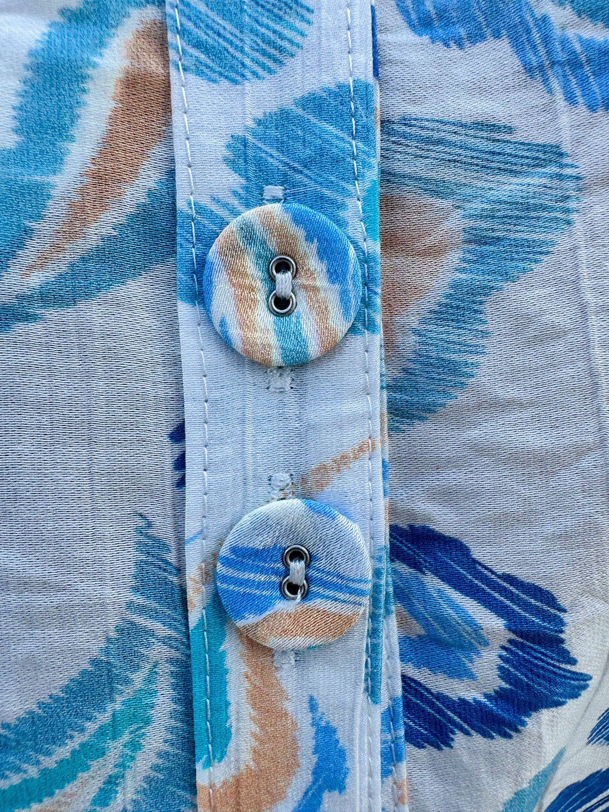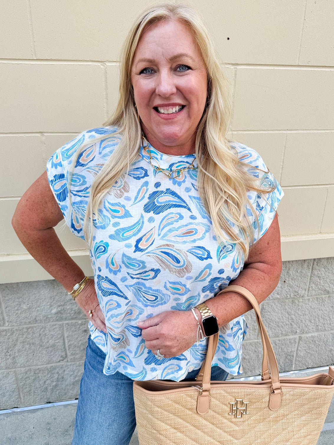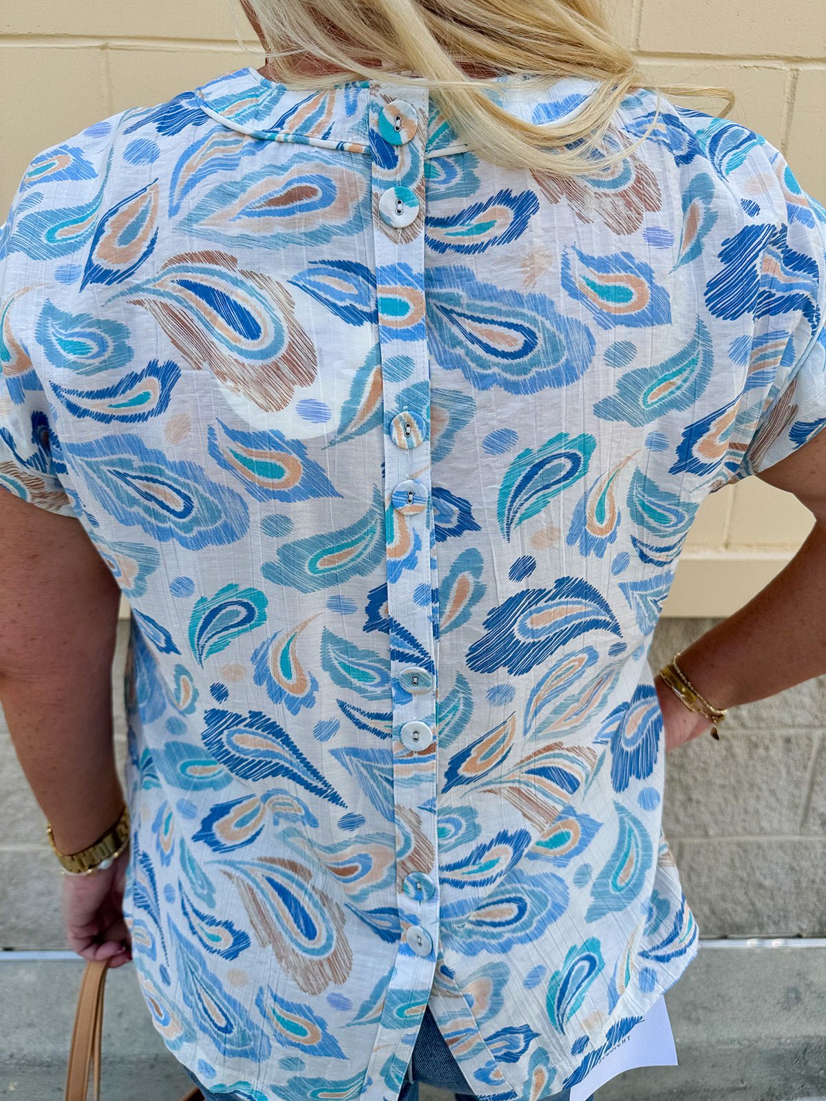 Brighten up your wardrobe with the Bubbly Personality Cap Sleeve Top—a cheerful blend of charm, color, and comfort. This cap sleeve blouse features a classic round neckline, soft blue paisley print, and delicate covered button details at the back for a subtle touch of elegance. Whether you're headed to brunch, work, or just out and about, this top delivers the kind of easy polish that works for any occasion.
