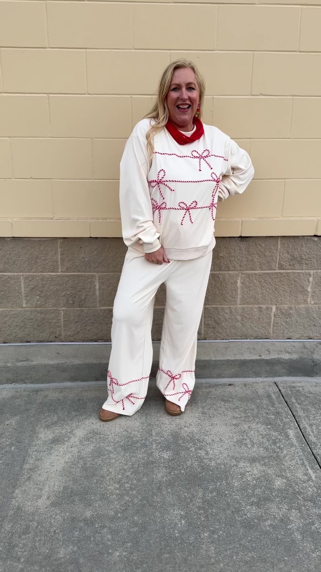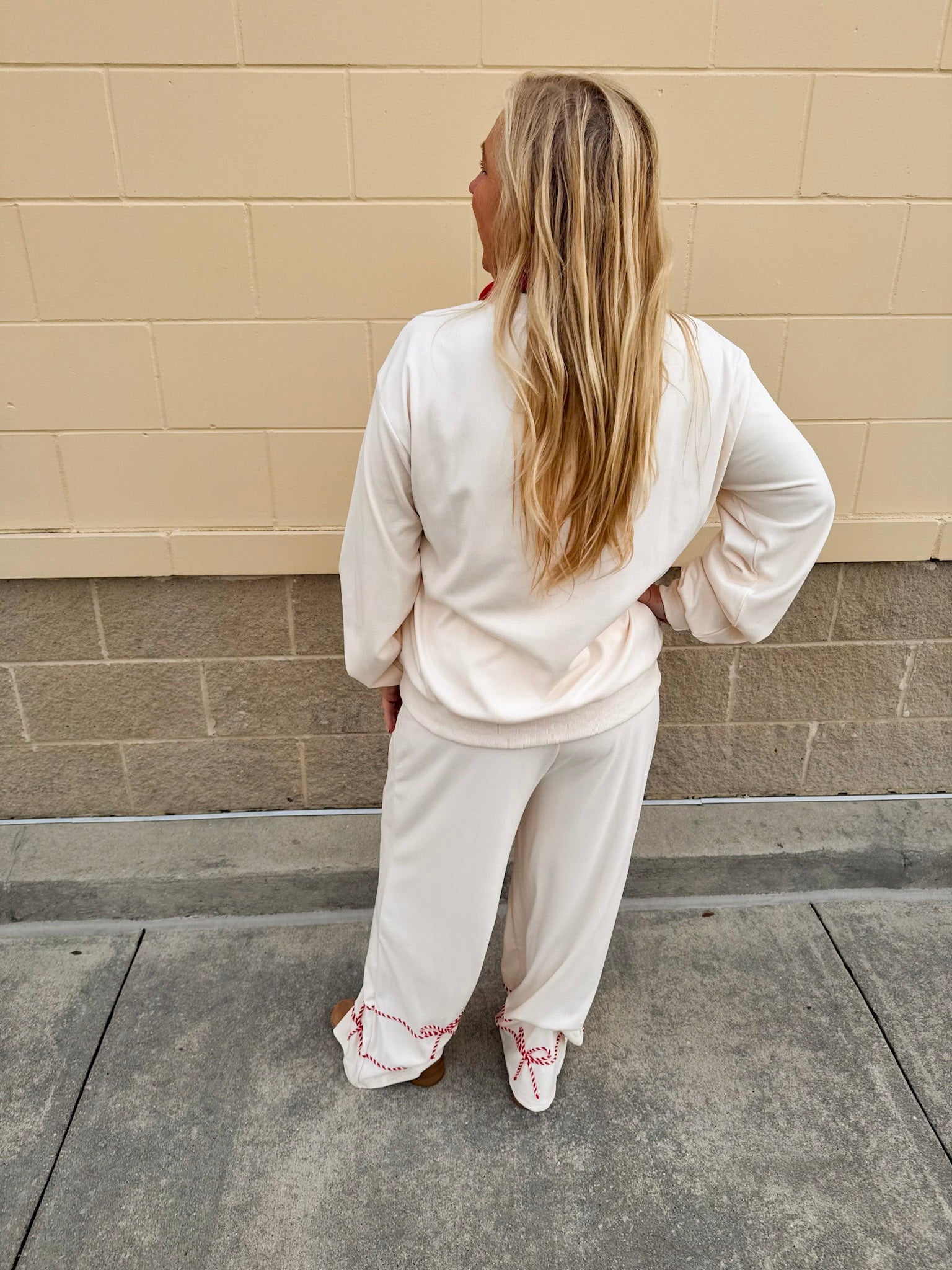 Looking for the softest, cutest holiday lounge set for cozy nights, festive mornings, and everything in between? The Candy Cane Cozy Lounge Set in Cream is your new seasonal must-have. Made from an ultra-soft fabric that feels like a warm hug, this two-piece set includes a long-sleeve crewneck top and matching long pants—both adorned with red and white candy cane–yarn bow detailing for the sweetest festive touch.