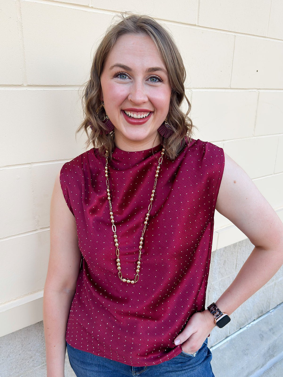 Looking for a top that’s equal parts chic and festive? The Celeste Mock-Neck Rhinestone Top in Burgundy is designed to bring effortless sparkle to your fall wardrobe. With its sleek mock neckline and sleeveless cut, it offers a polished silhouette that feels sophisticated yet easy to style.