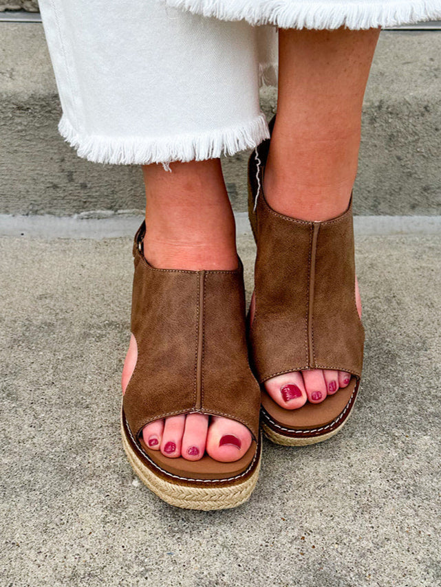 Set off any outfit with the effortless style of the Corky’s K Bye Wedge. Featuring a chocolate brown vegan leather upper with an easy strap-back peep toe and open side slits, these wedges combine comfort and breezy charm. The 2" wedge height adds just the right lift, while the raffia bottom brings a natural, earthy flair that makes these shoes stand out. Perfect for a casual day out or a night on the town, these wedges will elevate your wardrobe and your confidence with every step.