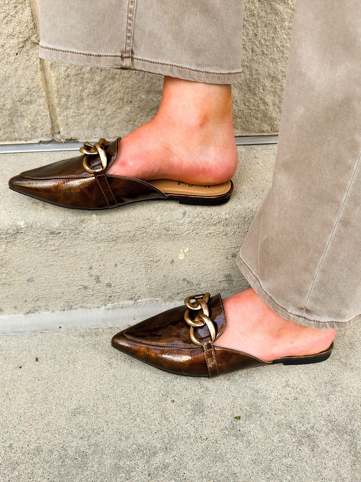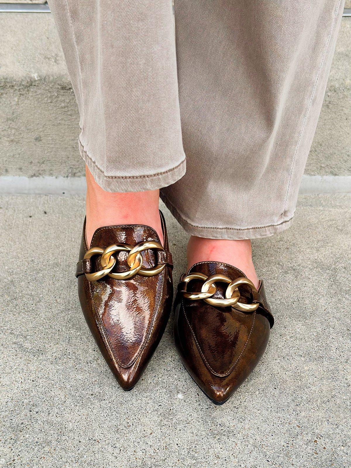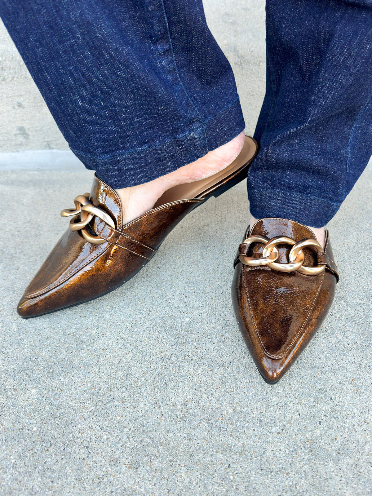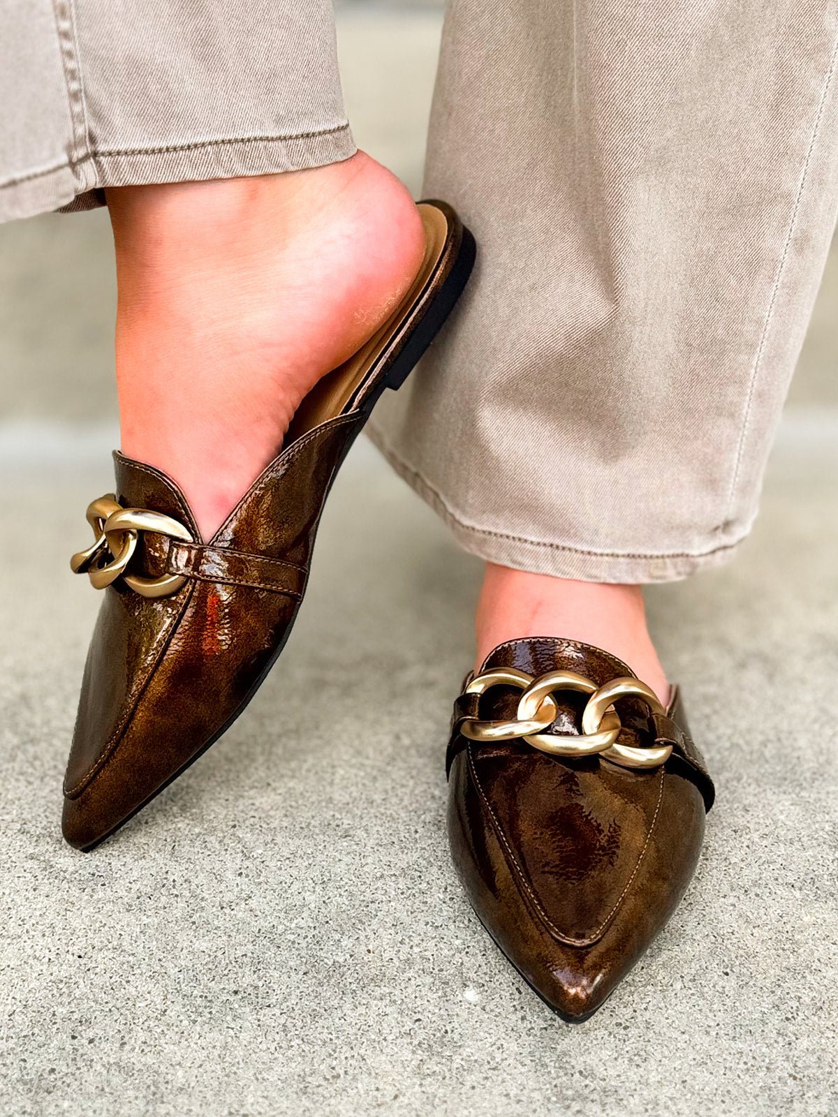Ready to turn heads with minimal effort? The Corkys Playin For Keeps Mule brings instant polish to any outfit with its glossy bronze finish and statement gold chain detail. This sleek slip-on style combines sophistication with all-day comfort, making it your go-to for everything from morning meetings to evening plans. The pointed toe silhouette adds a refined, feminine touch, while the flat sole keeps it easy and wearable. Designed for the woman who loves a little glam in her everyday routine, Playin For Keeps proves that comfort and confidence can go hand in hand. Slip them on and let your shoes do the talking.