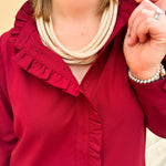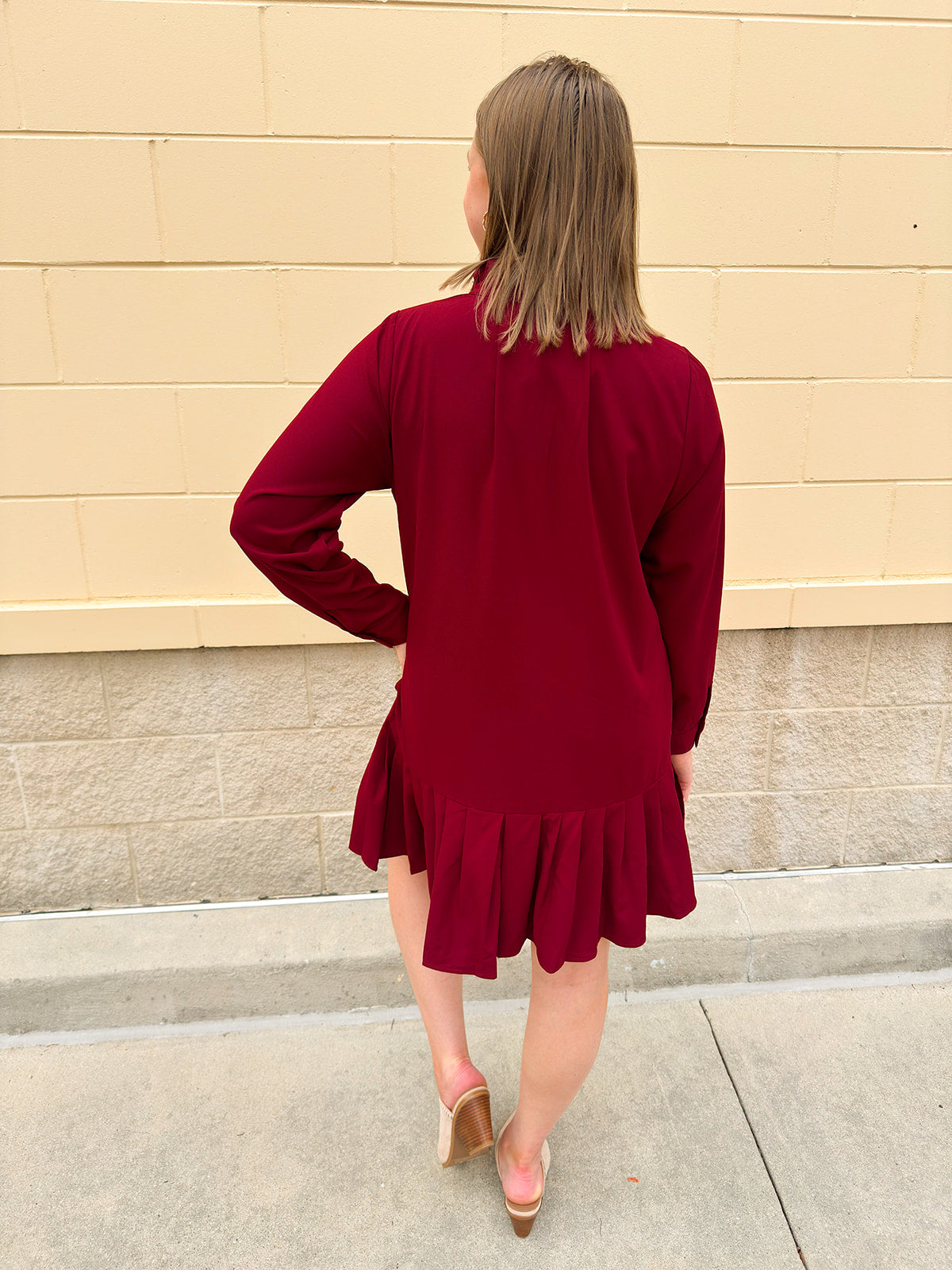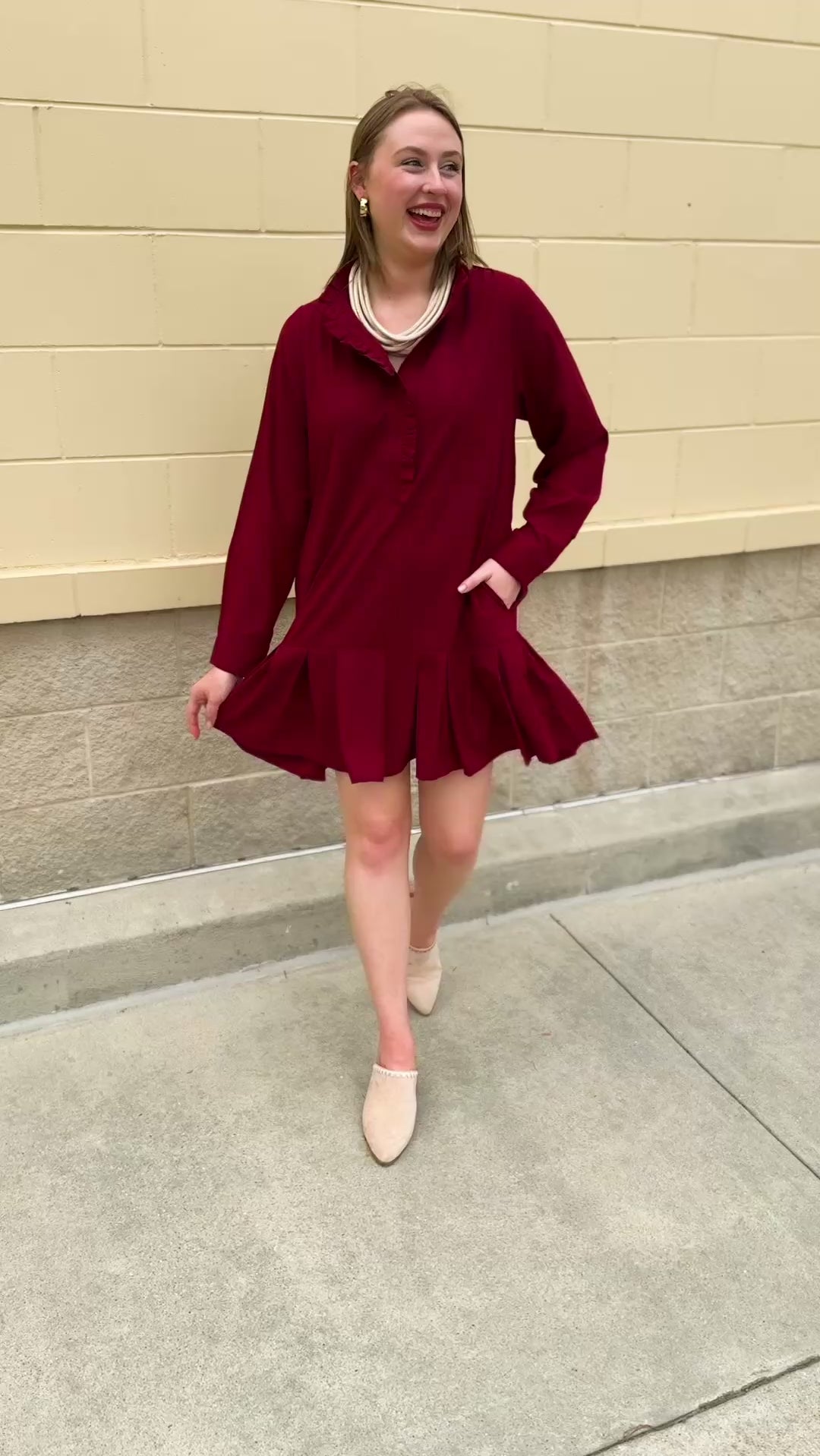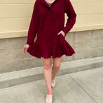 Need a dress that feels feminine, festive, and ready for every fall occasion? The Crimson Ruffle Reverie Shift Dress combines romantic details with effortless wearability. Designed in a rich maroon hue, this shift mini dress sets the tone for game days, dinners, and holiday gatherings. The ruffled mock neckline frames the face beautifully, while delicate ruffle accents add just the right amount of playful charm. Long sleeves and a button-down front keep the look polished, while the pleated hem and pleated back create movement and flow with every step. Side pockets add a practical touch without compromising style. The relaxed shift silhouette makes it comfortable and easy to wear, while the thoughtful detailing ensures it always feels chic. The Crimson Ruffle Reverie Shift Dress is a go-to piece that captures the season’s spirit and gives you that confident, pretty feeling every time you slip it on.