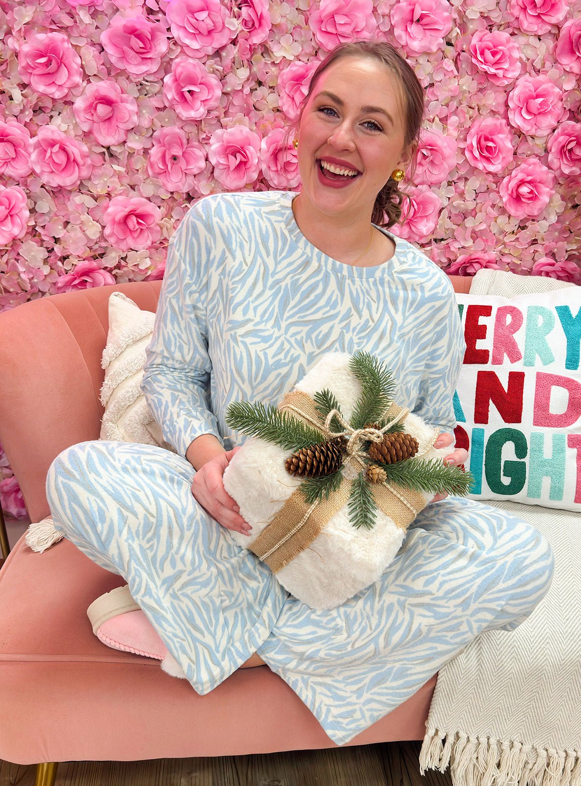 The top features a classic crew neckline and a relaxed fit, making it effortless to wear all day. Paired with wide-leg pants that have an elastic waistband, adjustable drawstring, and practical pockets, the set offers the perfect balance of ease and functionality. Its light blue and grey abstract animal print on an ivory background adds a chic boutique twist to traditional loungewear, so you can feel put together even while unwinding at home.