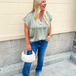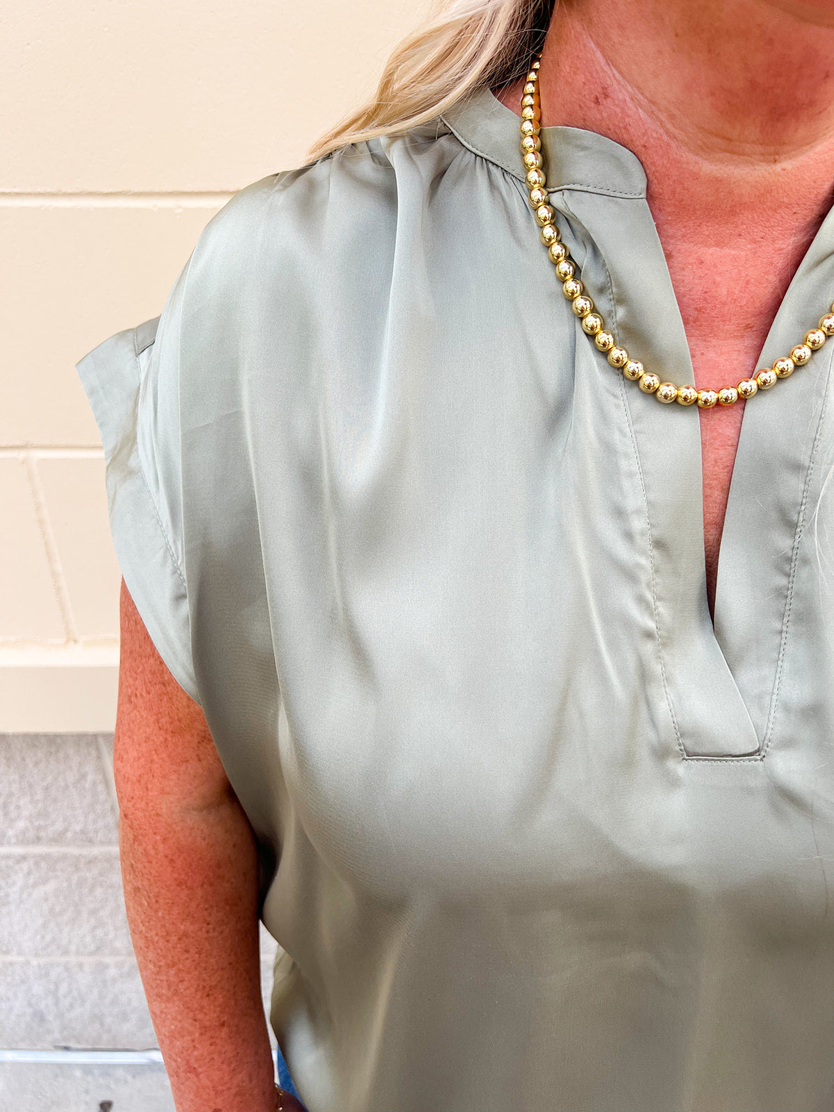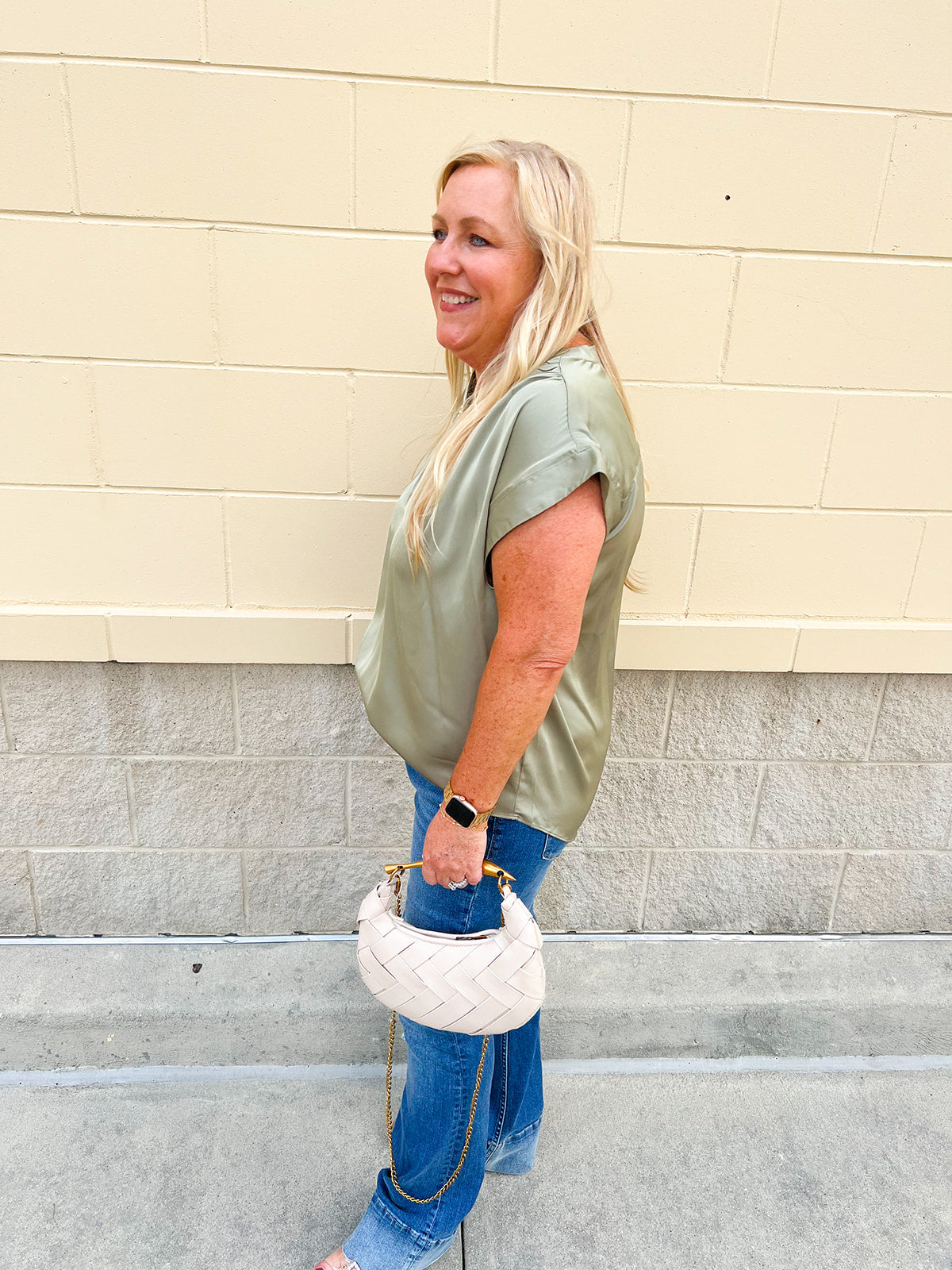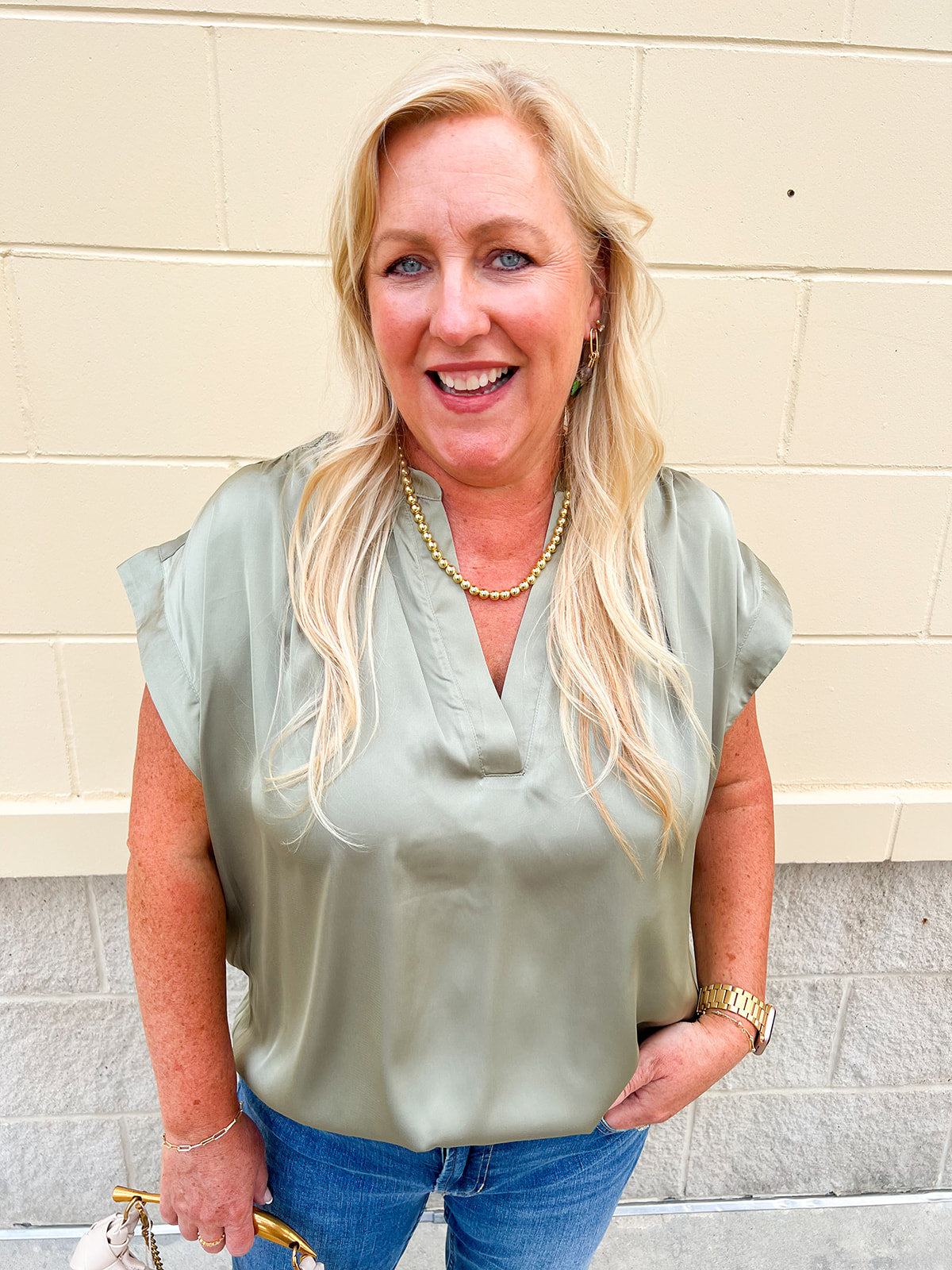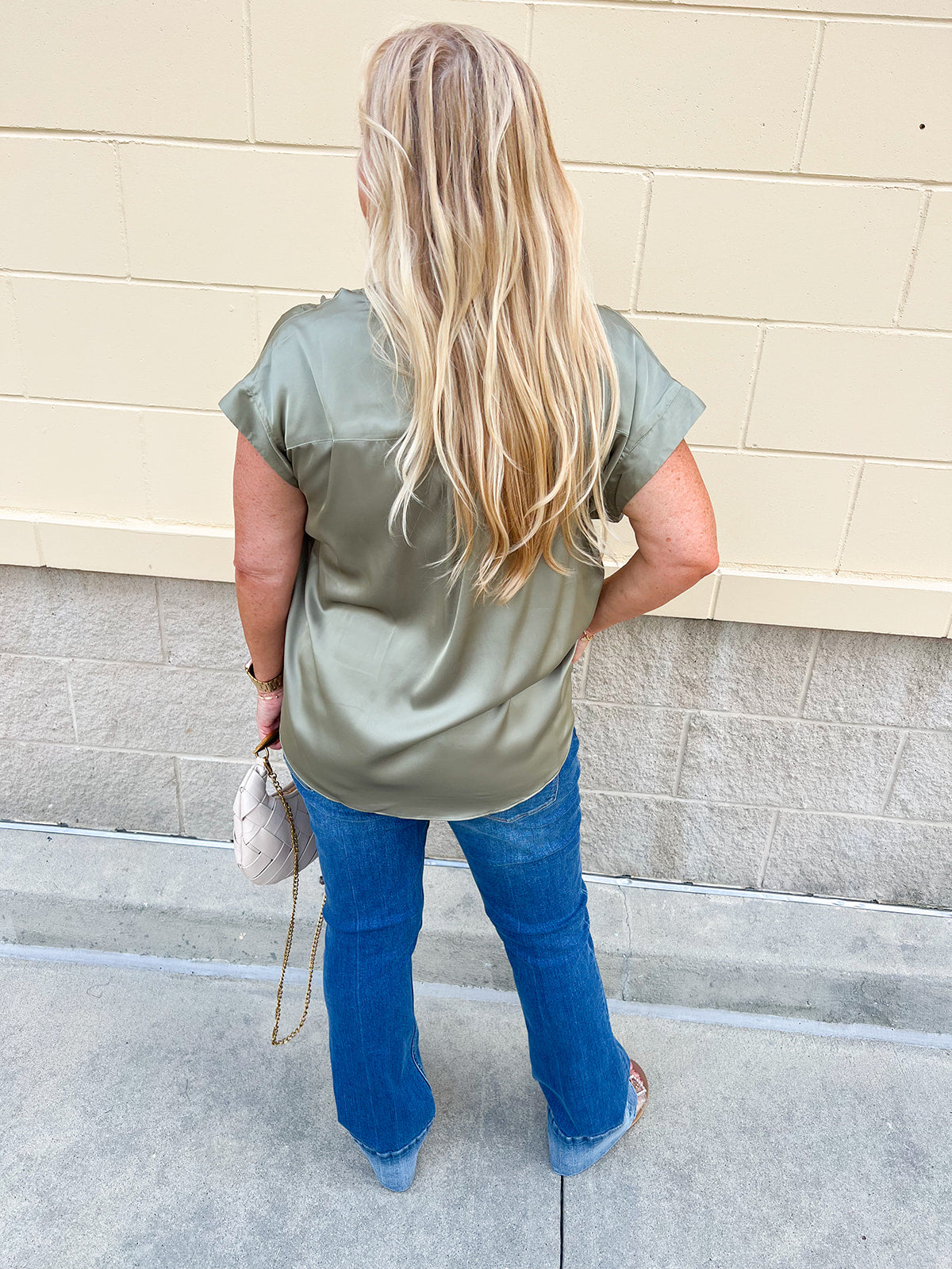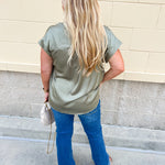 Refined meets relaxed in the Driftwood Silk Touch Blouse—your new go-to for everyday polish with zero effort. Designed in a rich dry herb hue (a soft, sagey green), this top features a silky finish that catches the light beautifully. The wide short sleeves with cuff detail and split V-neckline keep the silhouette modern and wearable, while subtle gathering at the back yoke adds just the right amount of movement and drape. It's the kind of piece that works just as well tucked into trousers as it does loose over denim.