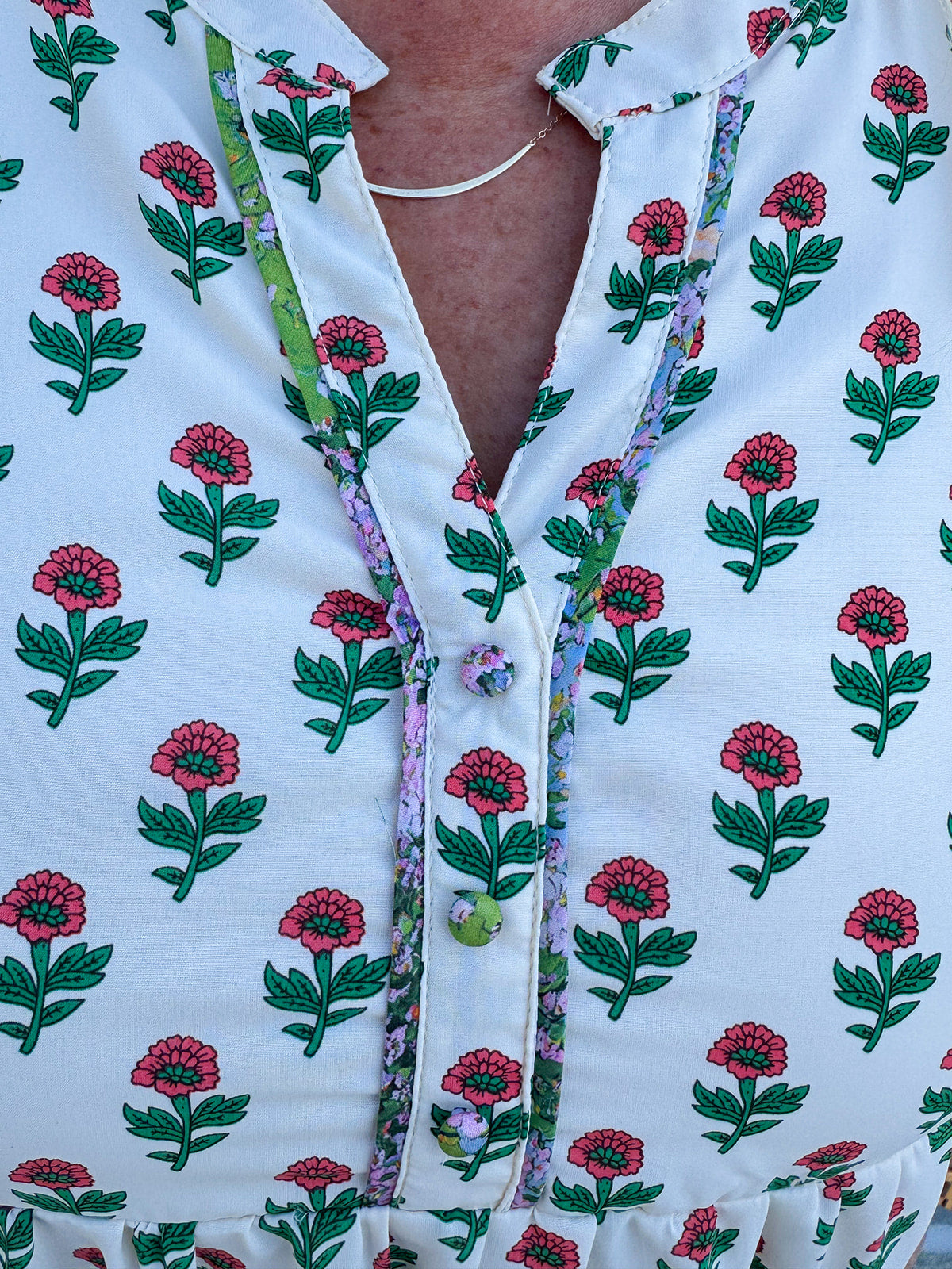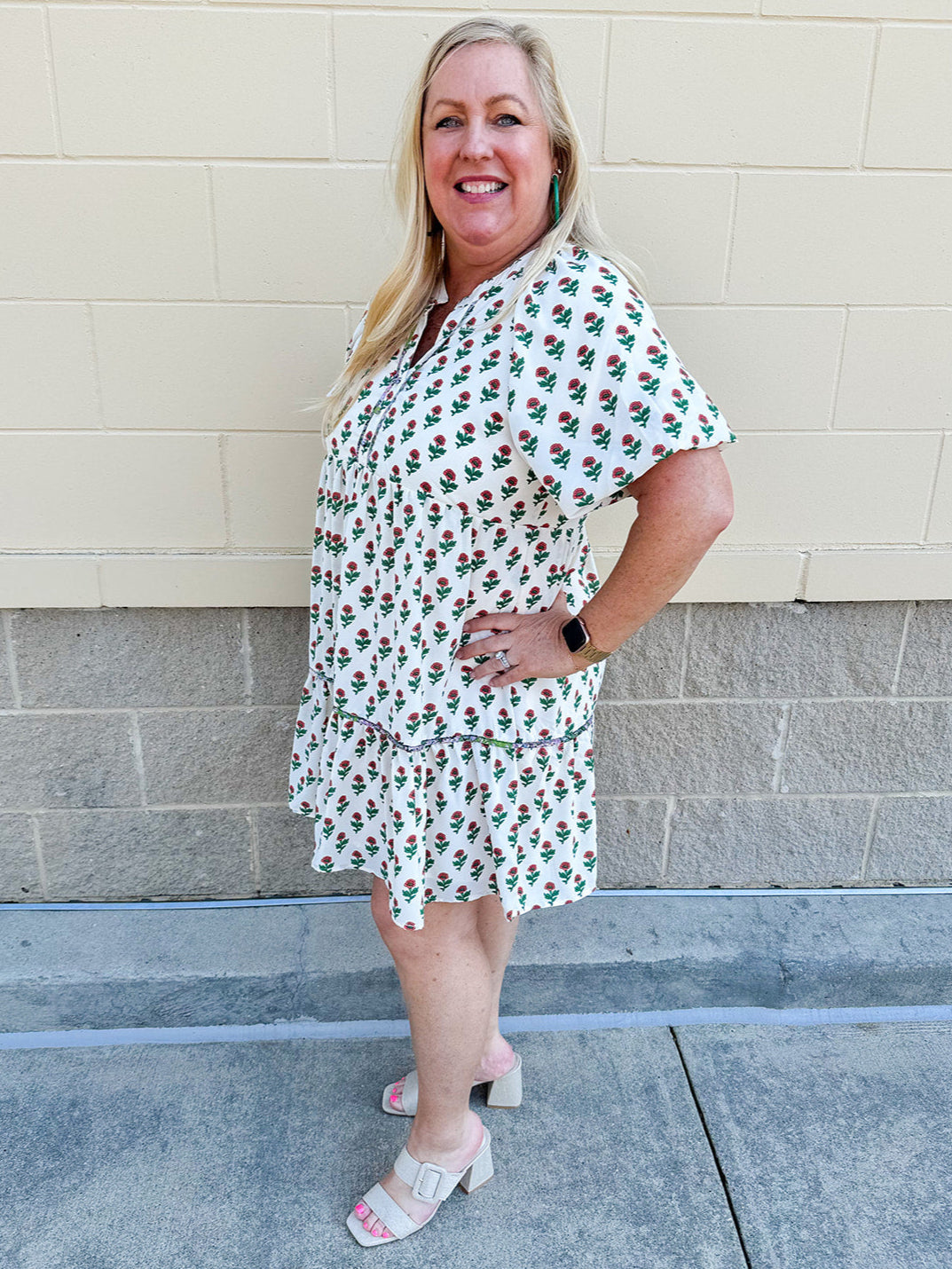 This dress features a delightful floral print and a V-neckline with intricate floral trim. The short flutter sleeves add a touch of charm, while the relaxed babydoll silhouette provides a comfortable fit. The tiered hem, finished with delicate lace trim, adds an elegant touch. Lined for added comfort.