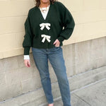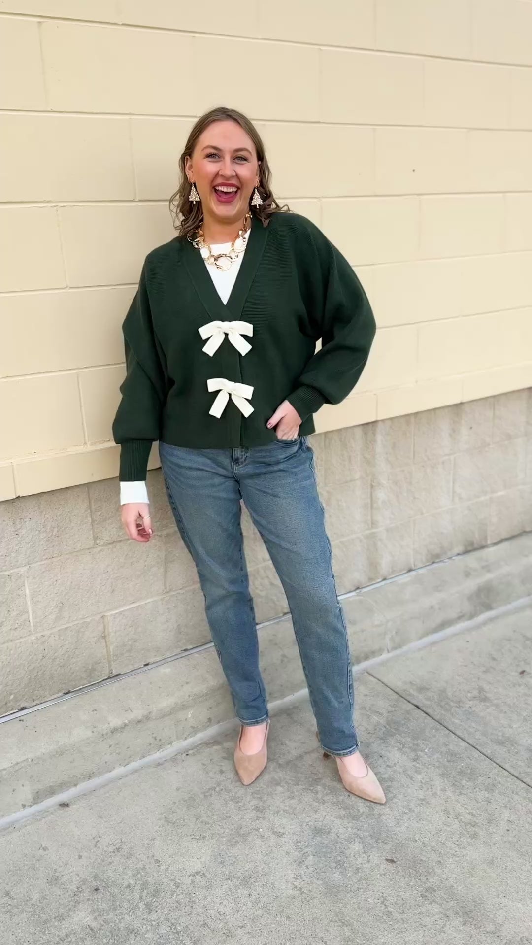 Add a festive touch to your holiday wardrobe with the Evergreen Charm Bow Cardigan. Crafted in a rich holiday green, this cozy yet polished sweater features two cream bows over snap buttons for a charming, playful accent. The drop sleeves and comfortable layering weight make it perfect for styling over dresses, tops, or blouses during seasonal gatherings, office parties, or cozy holiday brunches.