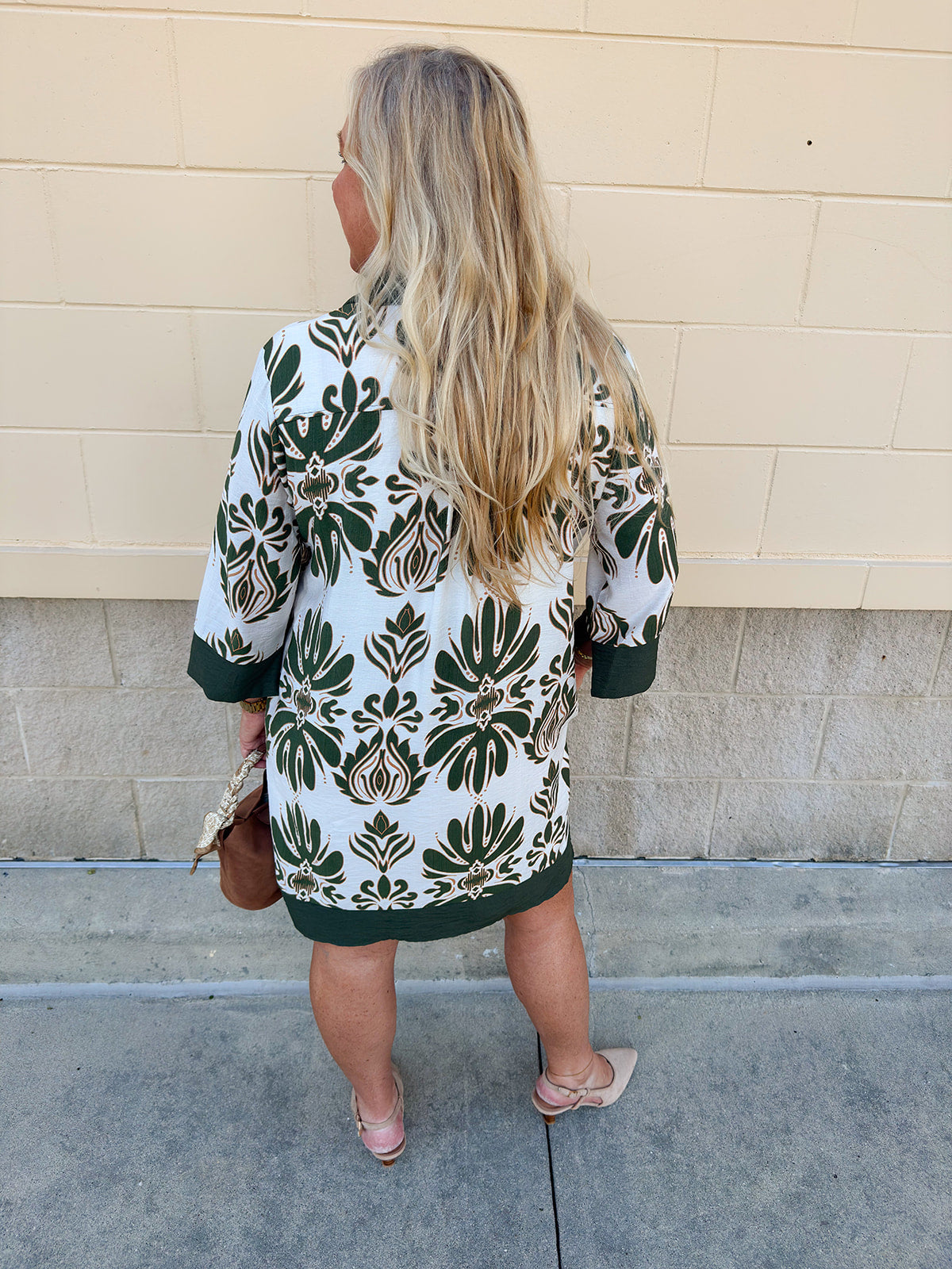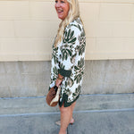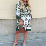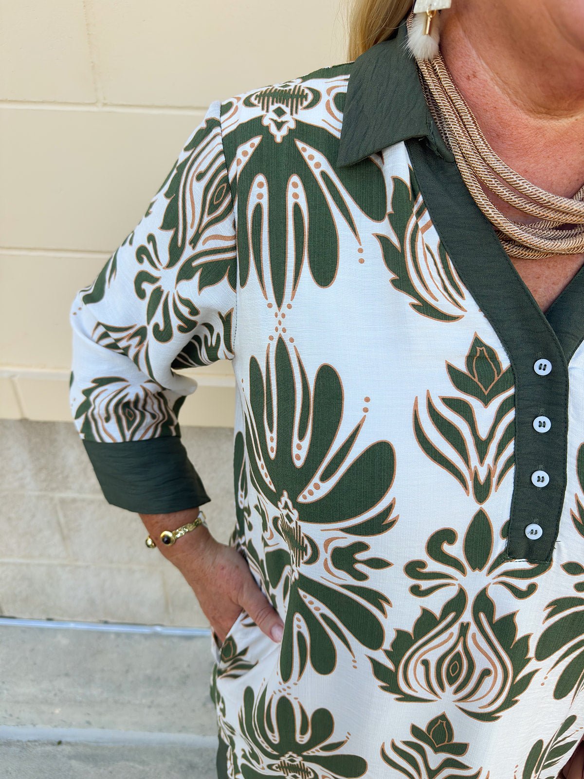 Looking for a dress that’s as versatile as it is pretty? The Evergreen Charm Mini Dress is designed to take you seamlessly from fall afternoons to holiday gatherings. Crafted in an olive and cream patterned fabric, this dress blends seasonal tones with an easy, feminine silhouette. The collared V-neckline with delicate button detailing adds polish, while the flowy A-line fit and ¾ sleeves keep it relaxed and comfortable. And yes—it has pockets, making it both stylish and functional.