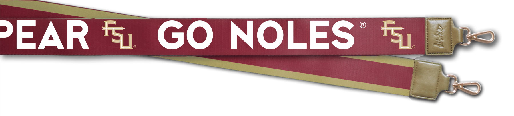 Crafted from thick, durable webbing with full-color decoration, it features “Fear the Spear” and “Go Noles” on one side, and garnet and gold stripes on the other—so you can reverse it based on your vibe. The adjustable length (39" to 55") makes it easy to wear as a crossbody or over-the-shoulder. Finished with brass hardware and vegan leather accent tabs, it's built to last and easy to wipe clean after a full day of cheering.