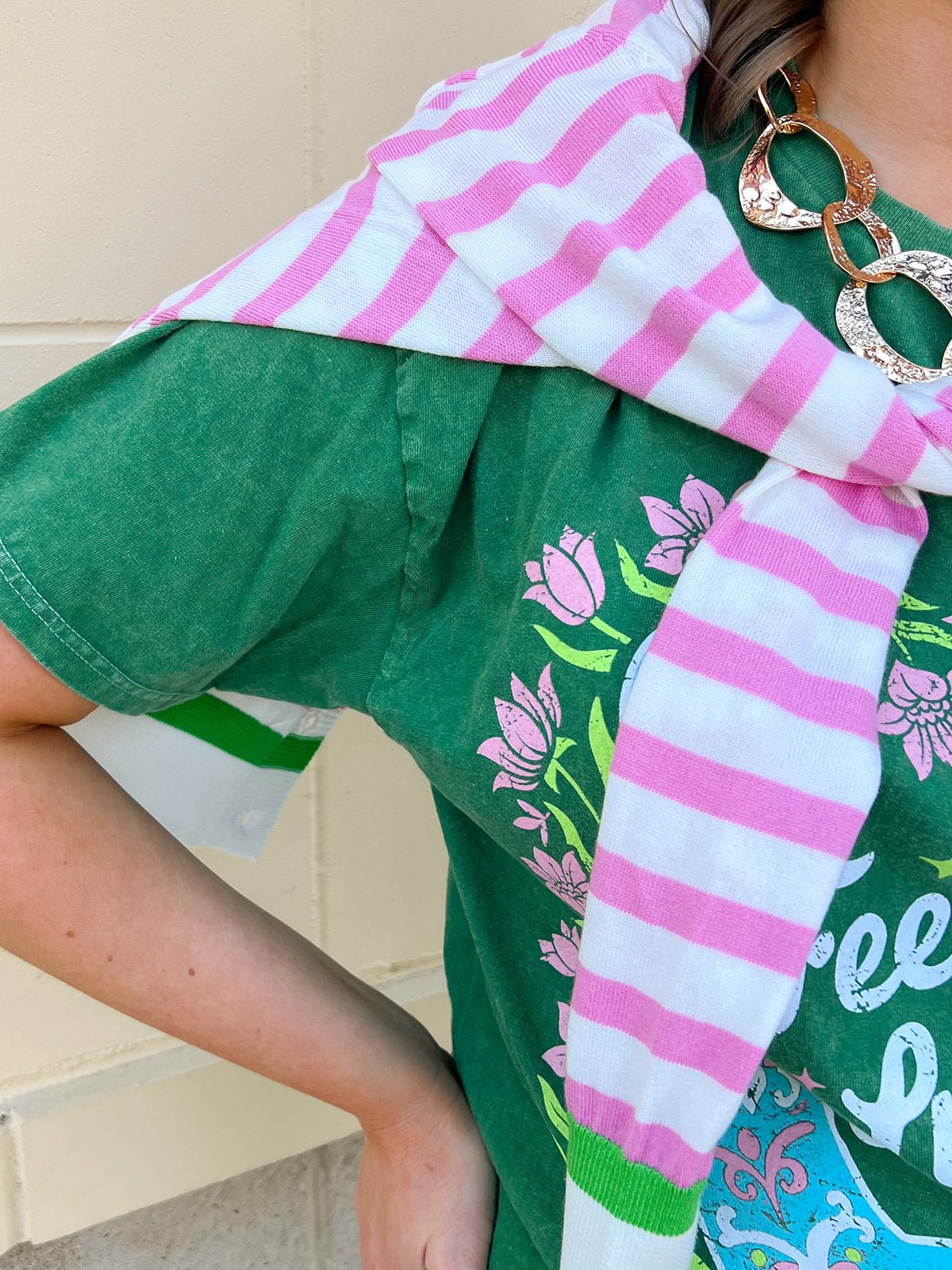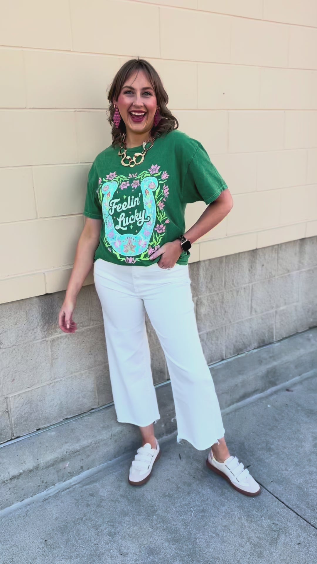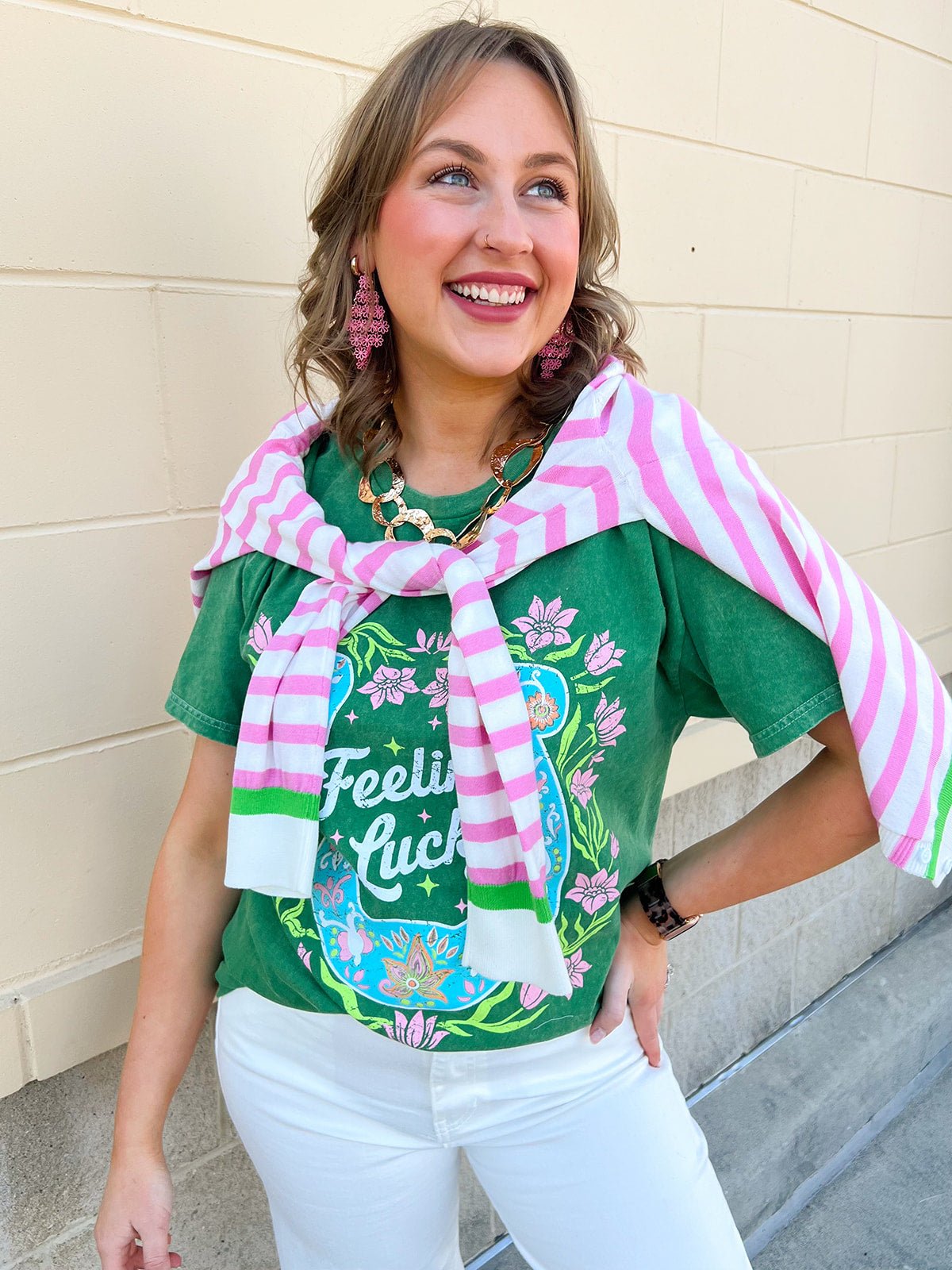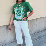 Playful and easygoing, the Feelin’ Lucky Horseshoe Tee is the perfect casual piece to add a little charm to your everyday wardrobe. This green short sleeve t-shirt features a classic relaxed fit with a fun horseshoe graphic and the phrase “Feelin’ Lucky” across the front. The soft fabric and easy silhouette make it a comfortable go-to for busy days, while the cheerful graphic adds personality and a touch of western-inspired style. Simple to pair with denim, shorts, or skirts, this tee is an effortless choice for laid-back outfits with a little extra character.