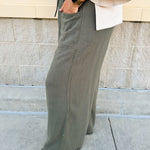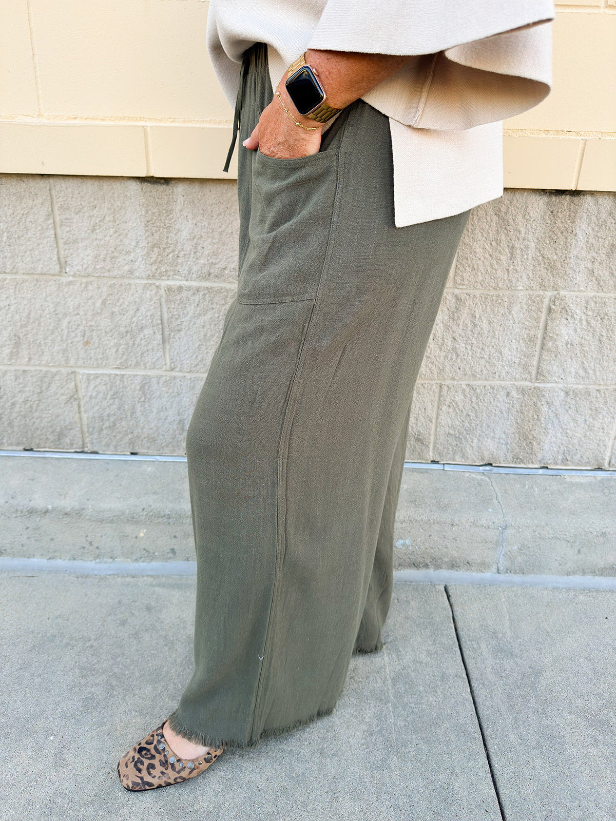 Fresh Breeze Frayed Wide Leg Linen Pants in Olive