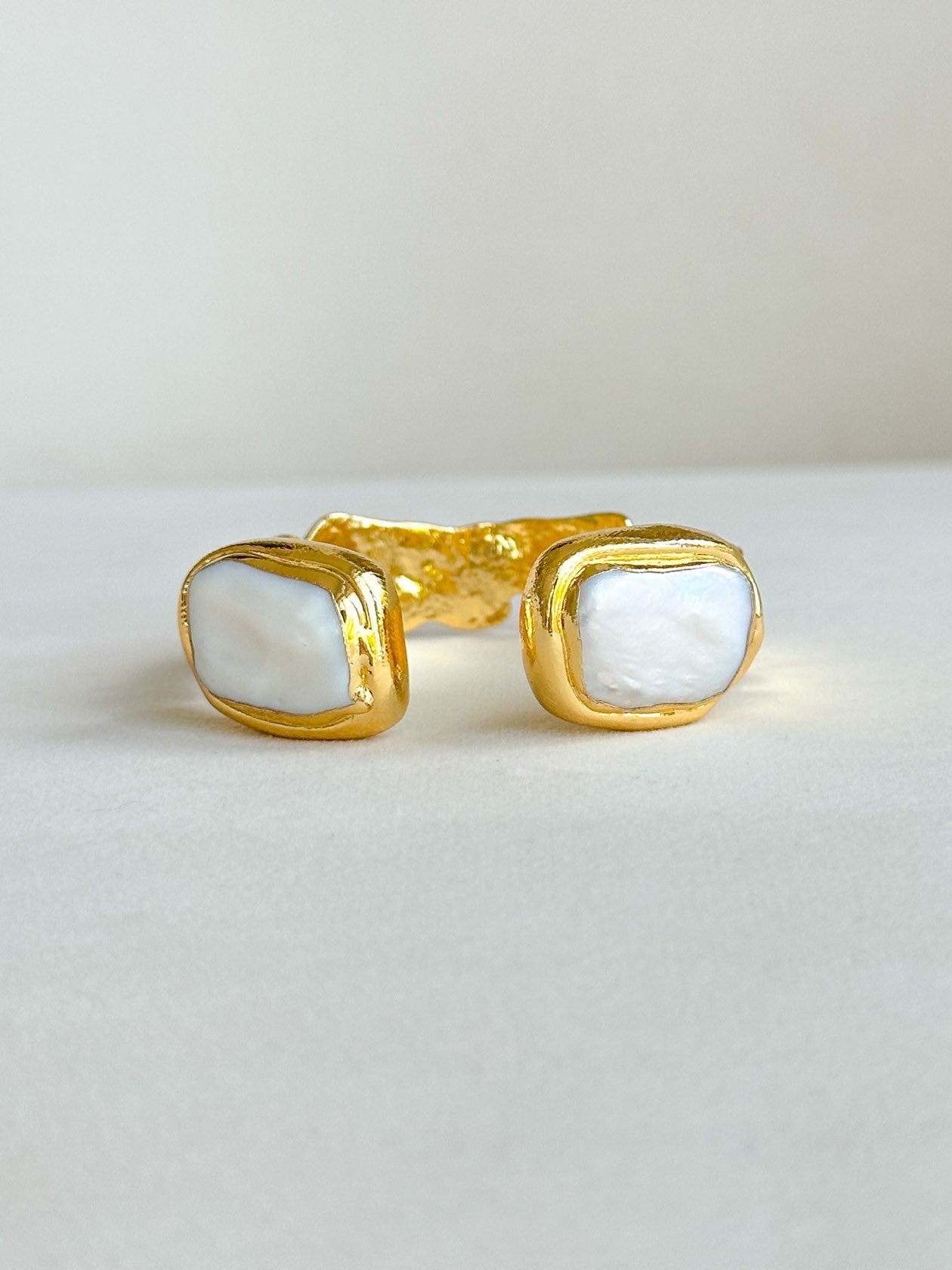 Looking for that perfect mix of timeless grace and modern minimalism? The Freshwater Pearl Mist Cuff by Easton Elle offers a fresh take on classic elegance. Hand-dipped in lustrous 18k gold, this open cuff features two luminous medium-sized freshwater pearls on either end—each one naturally unique, radiating a soft, iridescent glow. The balance of gold and pearl creates a look that’s effortlessly refined, versatile, and endlessly feminine.