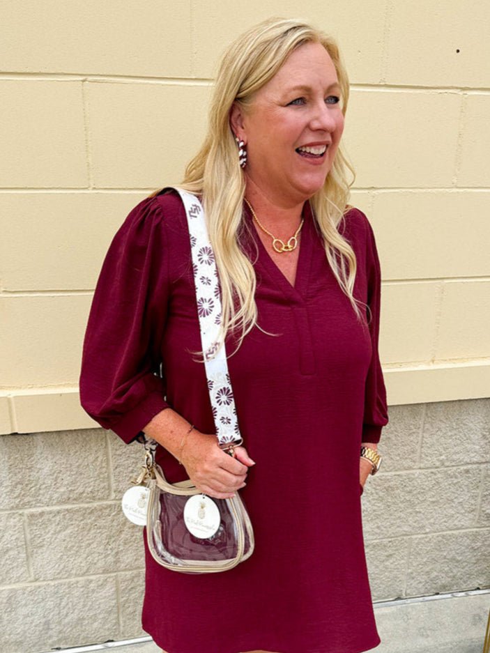 Crafted to pair perfectly with our clear purse collection, this strap features high-quality brass-finished hardware and a fully adjustable length for your ideal fit. The reversible design gives you two looks in one, so you can switch it up depending on your vibe. Simply clip it on and go—game day just got prettier!