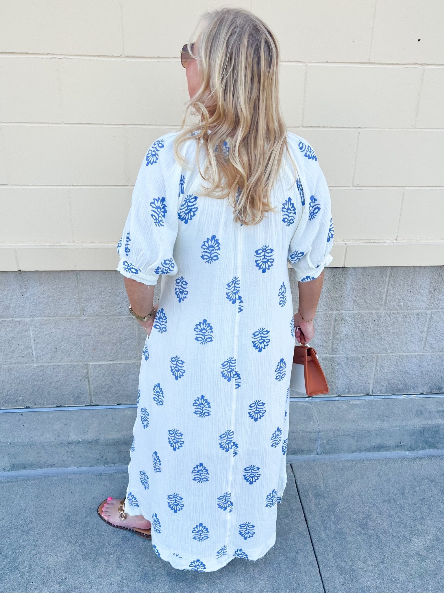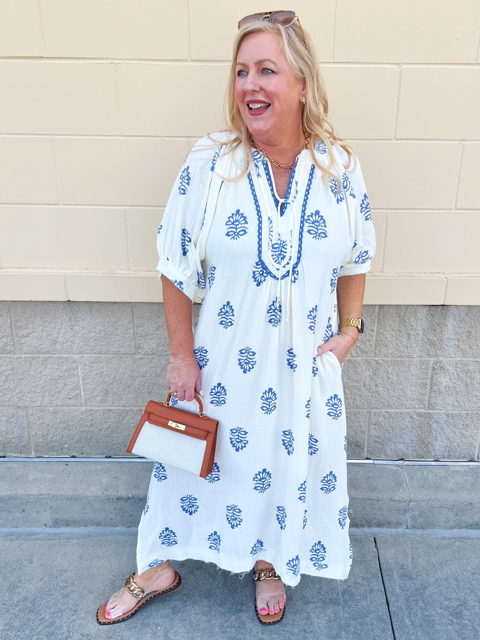 The flattering v-neckline features a delicate tie detail, adding a romantic touch, while blue floral embroidery dances across the crisp white fabric for a fresh, garden-inspired look. Blue lace stitching along the edges elevates the design with a refined, delicate finish. Softly puffed sleeves hit just above the wrist, adding a hint of volume that balances the lightweight, flowing skirt.