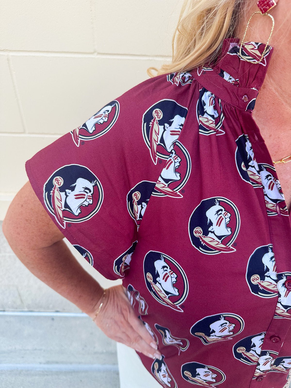 Looking for a game day top that feels both polished and spirited? This poplin blouse is the perfect mix of elevated detail and team pride. Designed in 100% cotton for comfort and breathability, it features a high stand ruffle collar, button-down bodice, and angled short sleeves that flatter every shape. The allover garnet background is patterned with the classic Seminole head in gold, making this piece instantly recognizable and officially licensed with FSU.