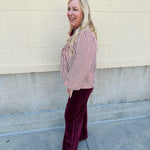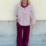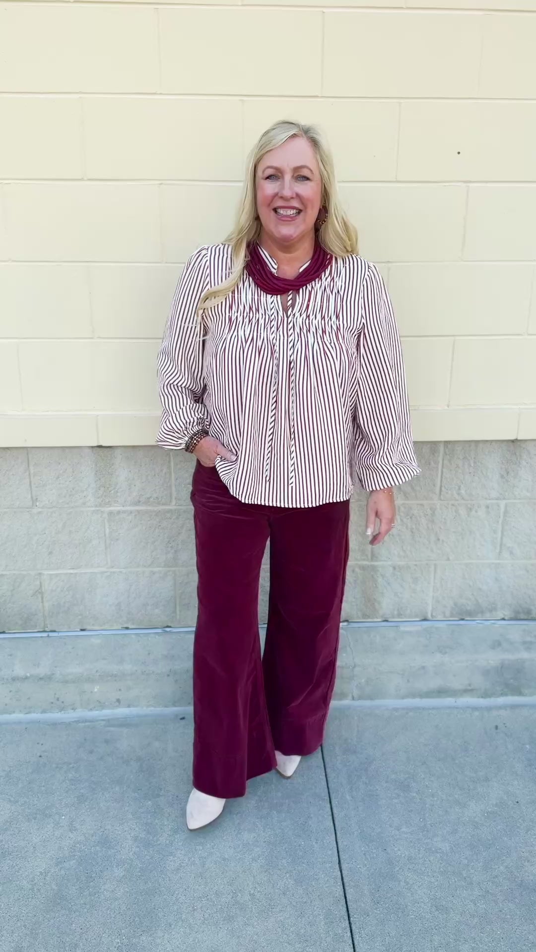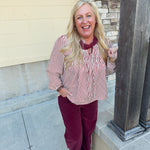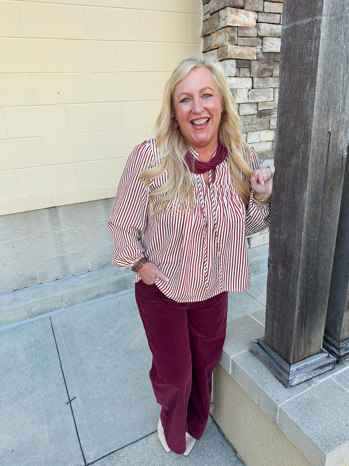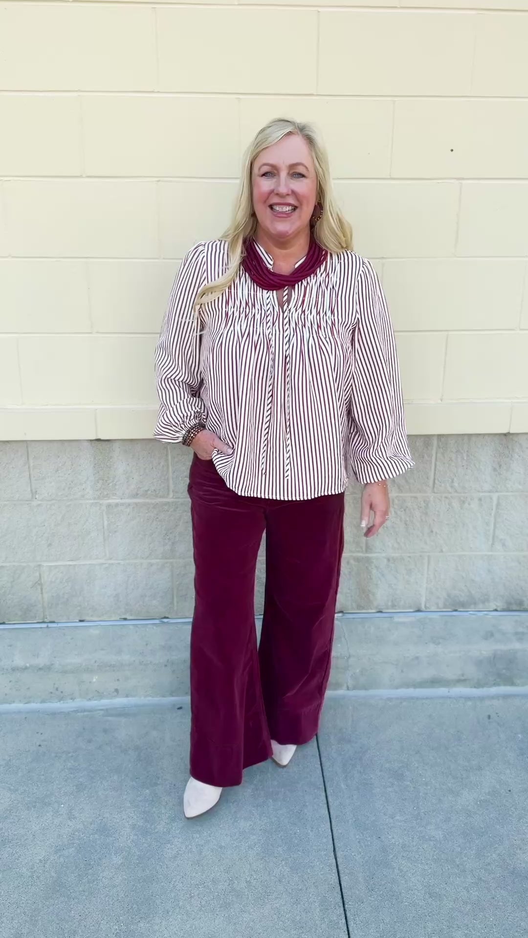 Elevate your fall wardrobe with our Garnet Stride Pintuck Blouse — a timeless long-sleeve blouse in a chic garnet stripe. Designed with delicate pintuck detailing for added texture and sophistication, this lightweight top pairs boutique styling with everyday versatility. Its soft drape and flattering cut make it perfect for game days, workdays, and weekend plans alike.