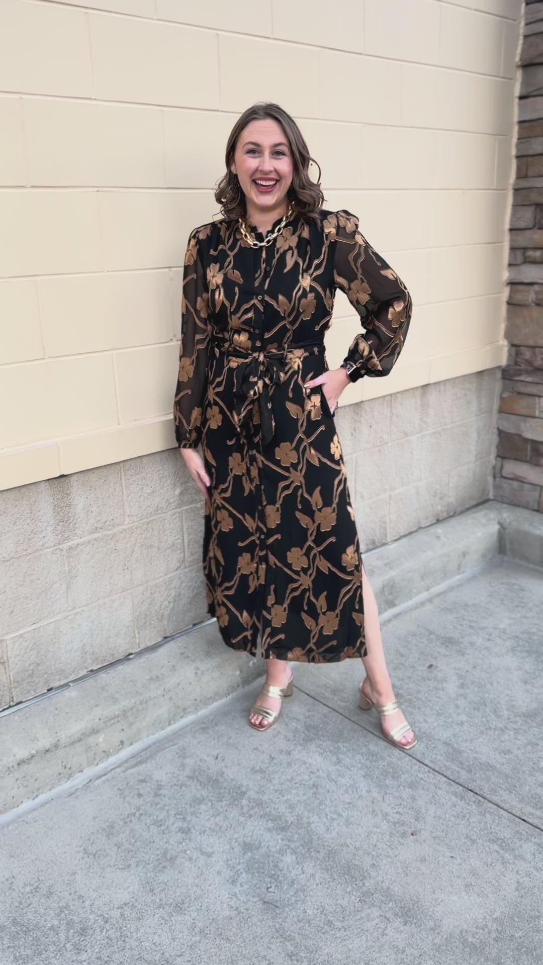 Sophisticated with a hint of drama, the Gilded Evening Belted Long Sleeve Dress is designed to make an elegant statement wherever the night takes you. Crafted in classic black with striking gold detailing, this dress blends timeless style with elevated flair. The long sleeves and refined silhouette create a polished look, while the metallic accents add just the right amount of shimmer for holiday parties, special events, and evening celebrations.