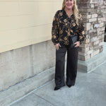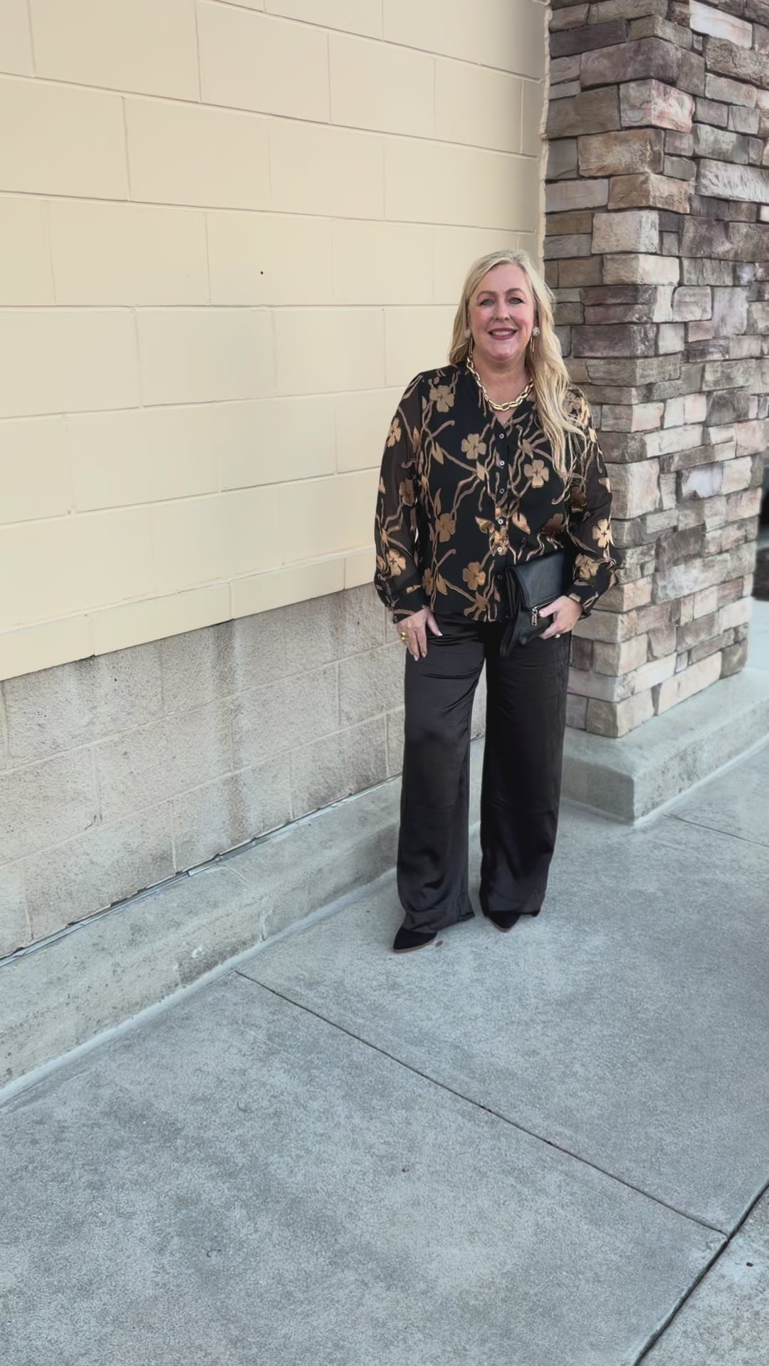 Sophisticated with a touch of shimmer, the Gilded Evening Button Front Blouse brings elevated elegance to your wardrobe in an effortlessly wearable way. Designed in classic black with striking gold detailing, this blouse offers a refined, statement-making look that feels timeless yet special. Gold-accented buttons run all the way down the front, adding a polished focal point while allowing for versatile styling—wear it fully buttoned for a sleek silhouette or slightly open at the neckline for a softer, evening-ready feel.
