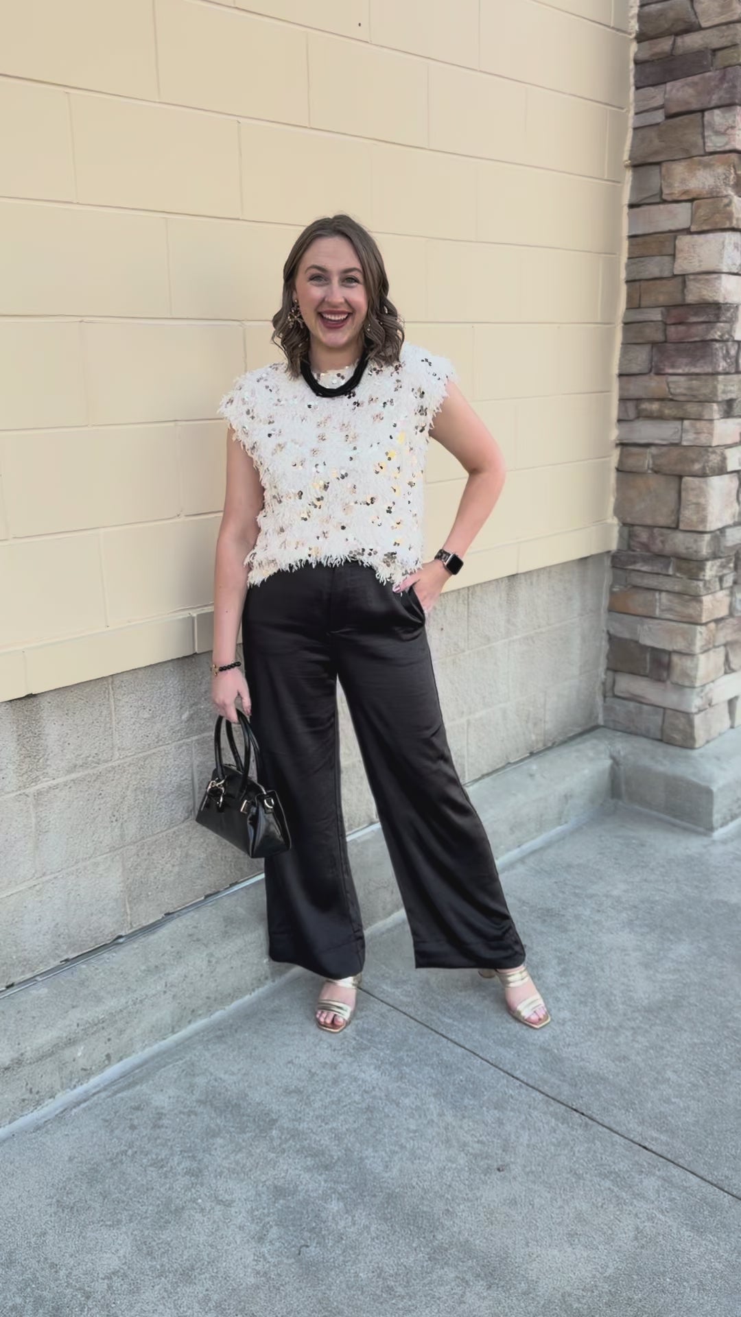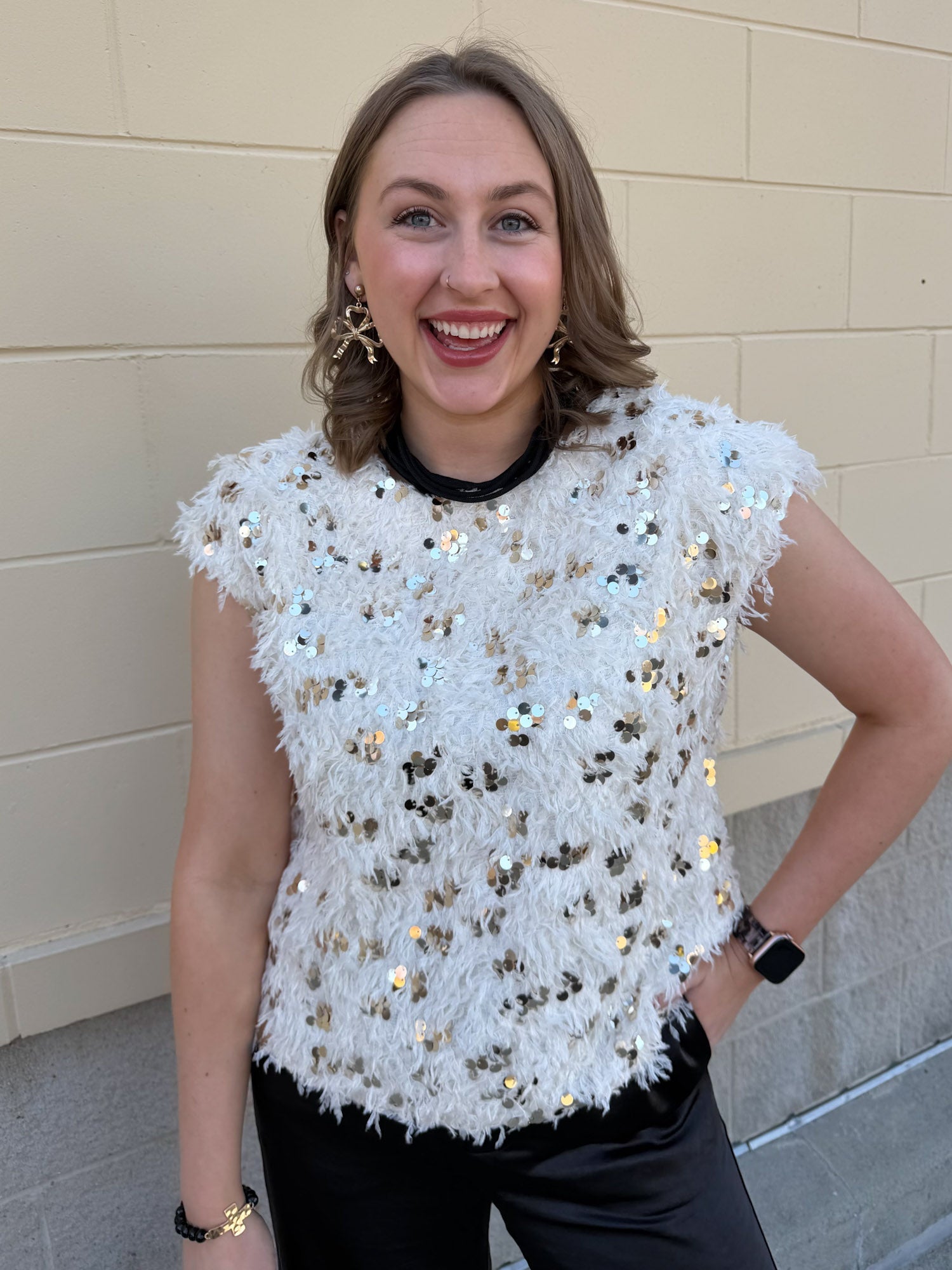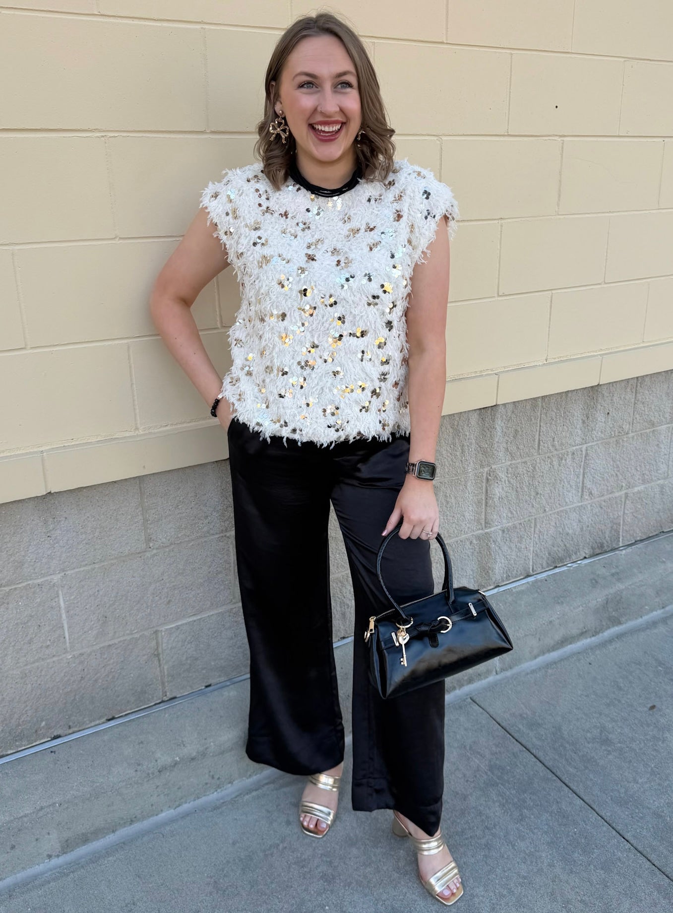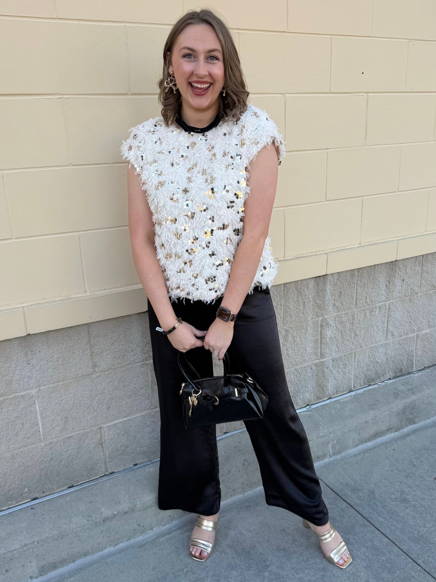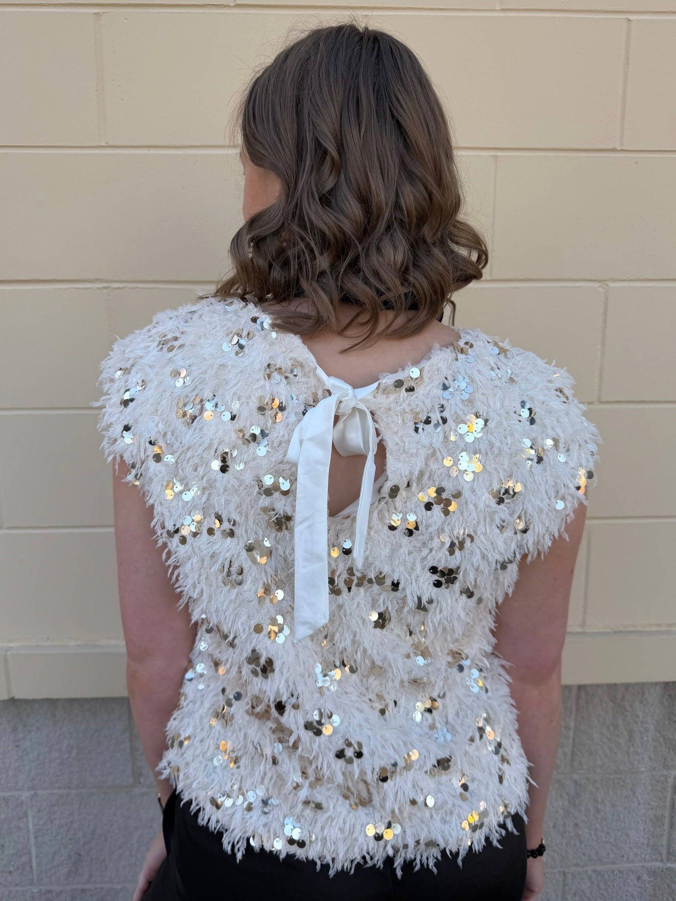 Ready to sparkle this holiday season? The Golden Glow Feather Sweater Top is the statement piece your wardrobe’s been waiting for. With its soft knit base and fluttery cream feather detailing accented by gold sequins, this top delivers just the right amount of glitz and glamour. The short sleeves and classic round neckline keep it versatile, while the sweet keyhole back with a bow tie detail adds a touch of feminine charm.