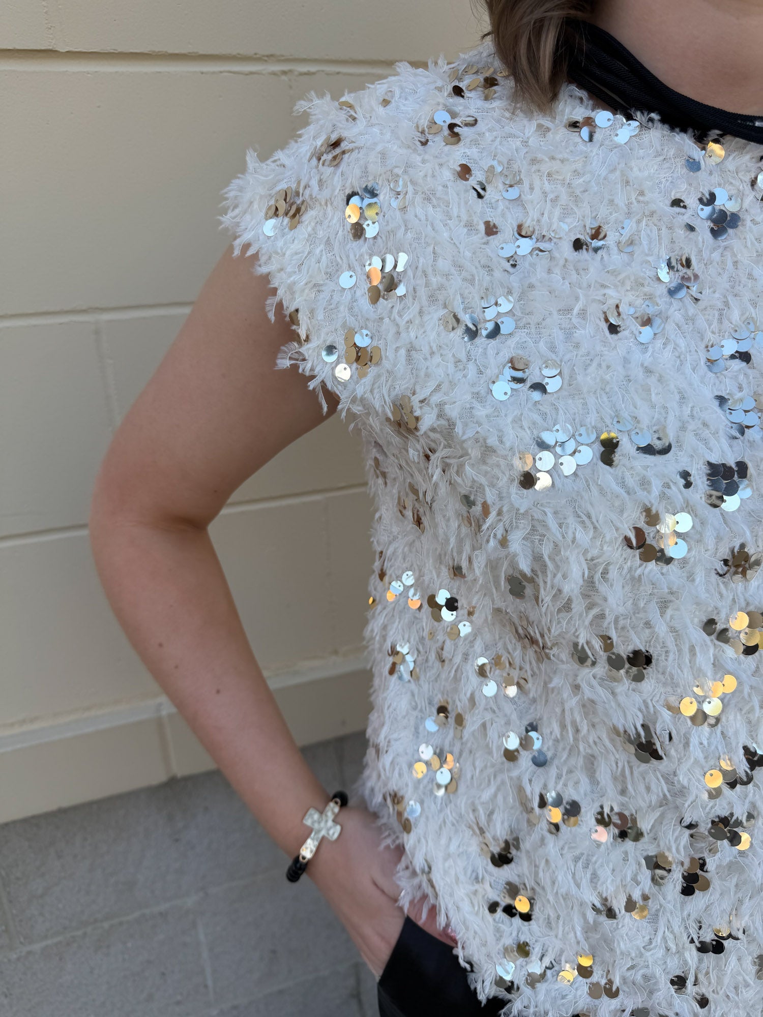 Layer it over a satin midi skirt and heels for a festive soirée, or dress it down with coated denim and booties for a chic day-to-night look. Add gold accessories to let those sequins truly shine.