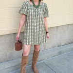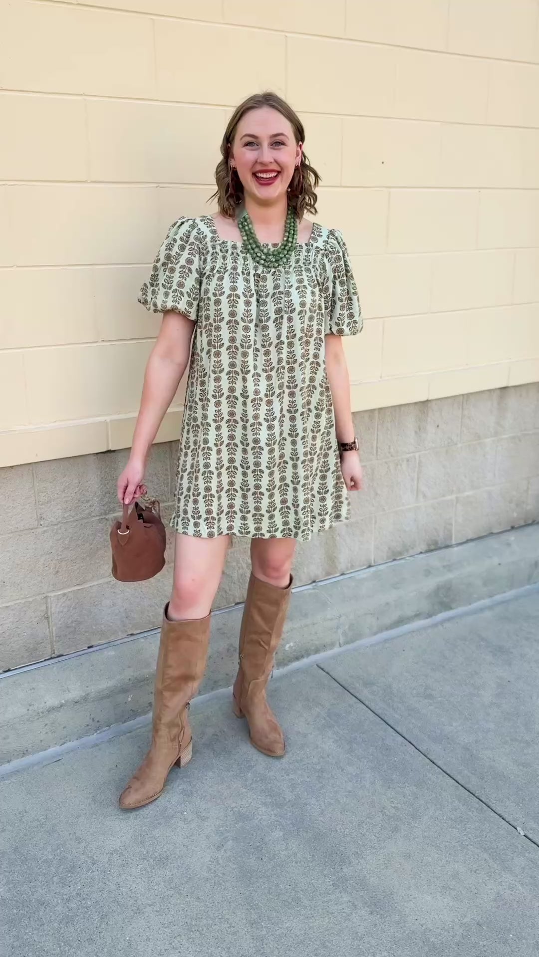 Lightweight and lined for all-day wear, this mini moves beautifully from brunch dates to evening outings. The subtle floral print and muted olive tone make it a timeless piece you’ll reach for again and again — chic, comfortable, and made for fall.
