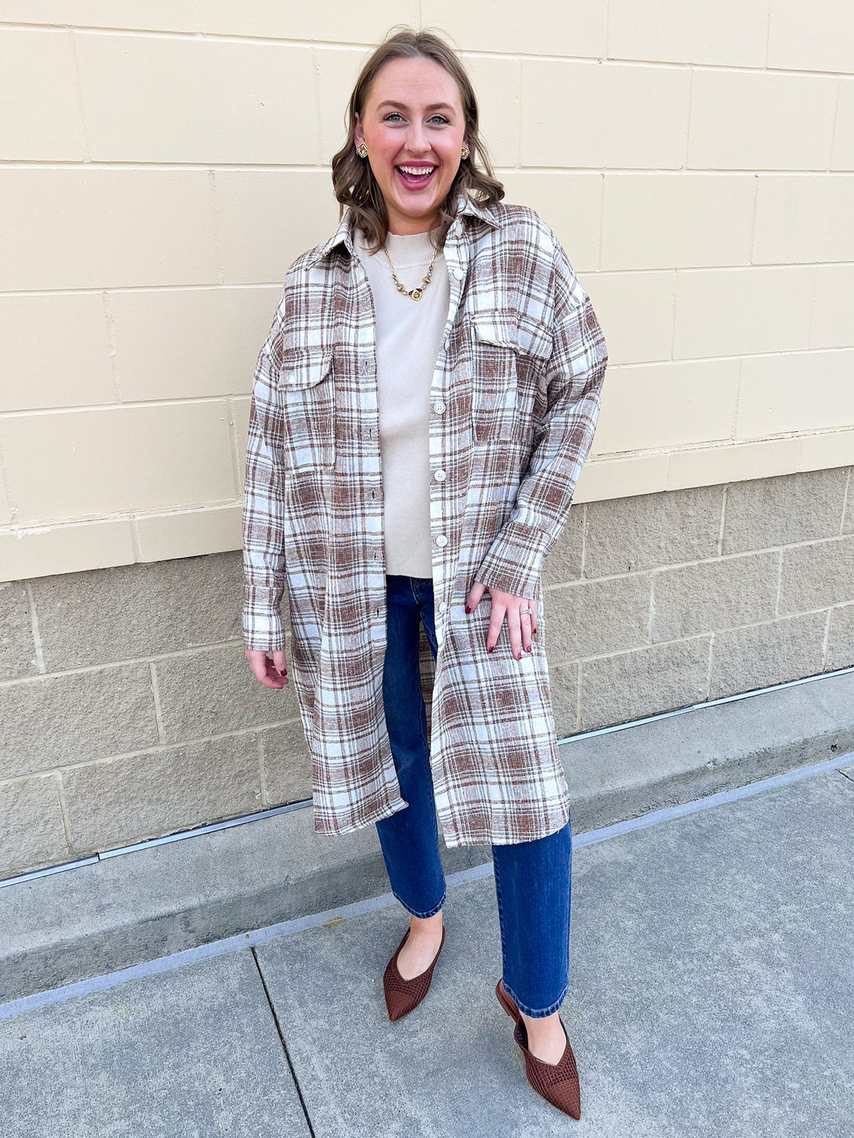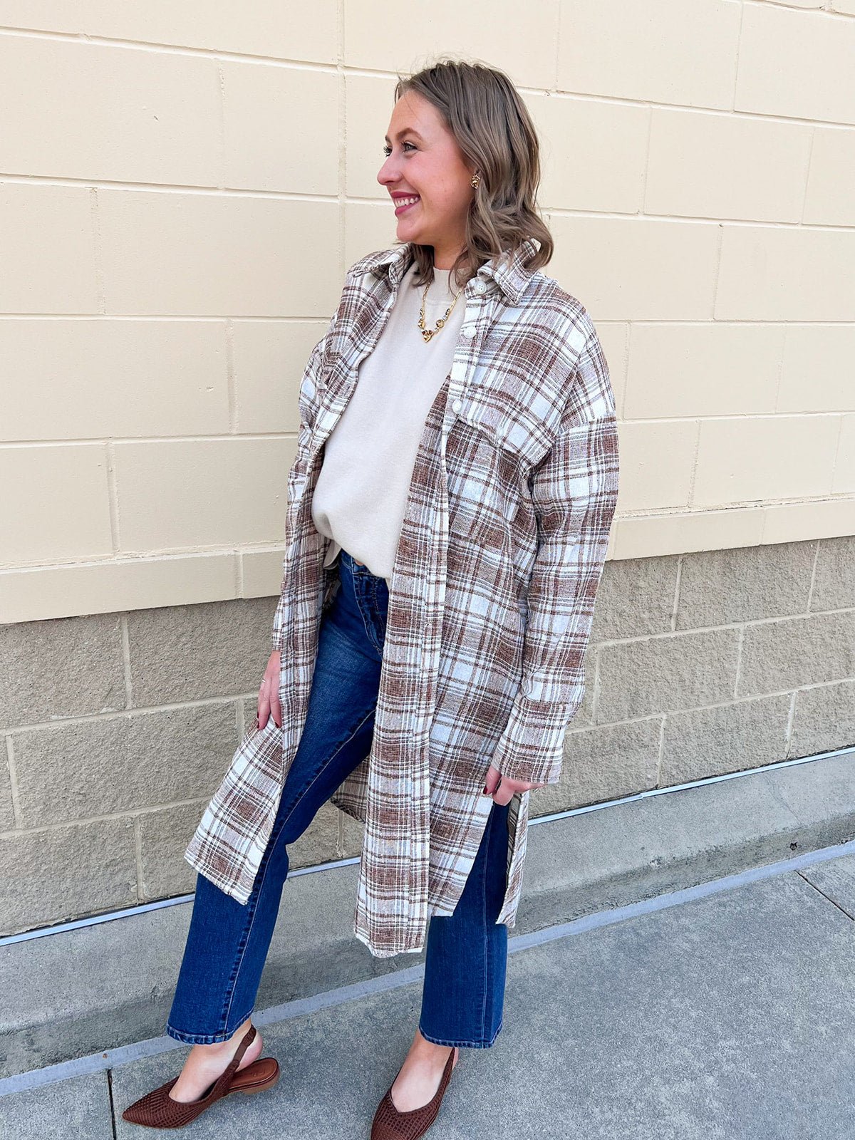 Need a layer that does it all? The Harper Plaid Longline Shacket in Tan Cream brings cozy comfort and effortless polish together in one timeless piece. Designed with a classic trench coat length, this lightweight shacket features a neutral plaid pattern in soft tans and creams—perfect for fall layering and holiday styling. The collared neckline and button-down front lend structure, while the combination of front and side pockets adds both function and flair. Subtle side slits give it movement and an easy drape that flatters every figure. Whether you’re dressing up denim or layering over knits, this versatile piece adds instant warmth and understated sophistication to your cold-weather wardrobe.