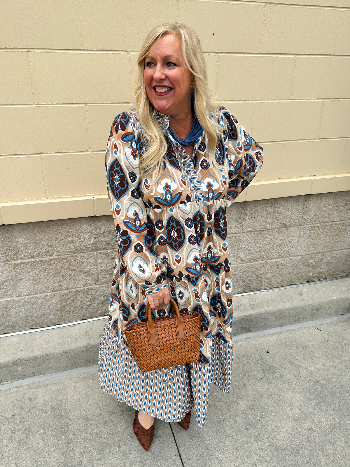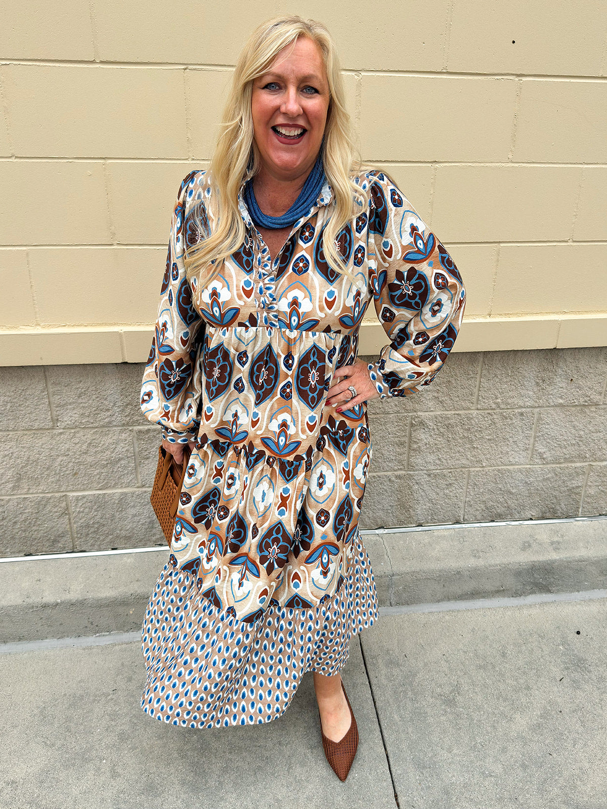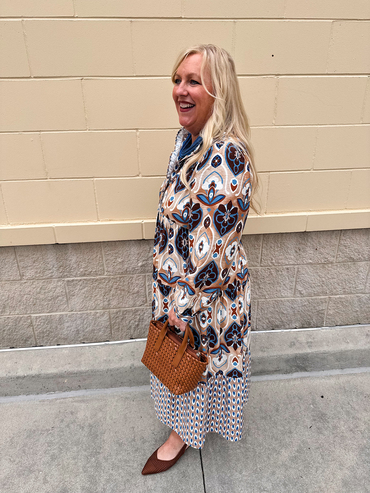 Craving a dress that feels like fall but wears like a dream? The Harvest Bloom Tiered Midi Dress captures everything we love about the season—warm hues, romantic details, and effortless movement. Designed in a beautiful mix of fall blues, creams, and browns, this dress blends soft prints with a flattering tiered silhouette that flows gracefully with every step.