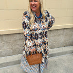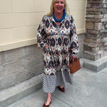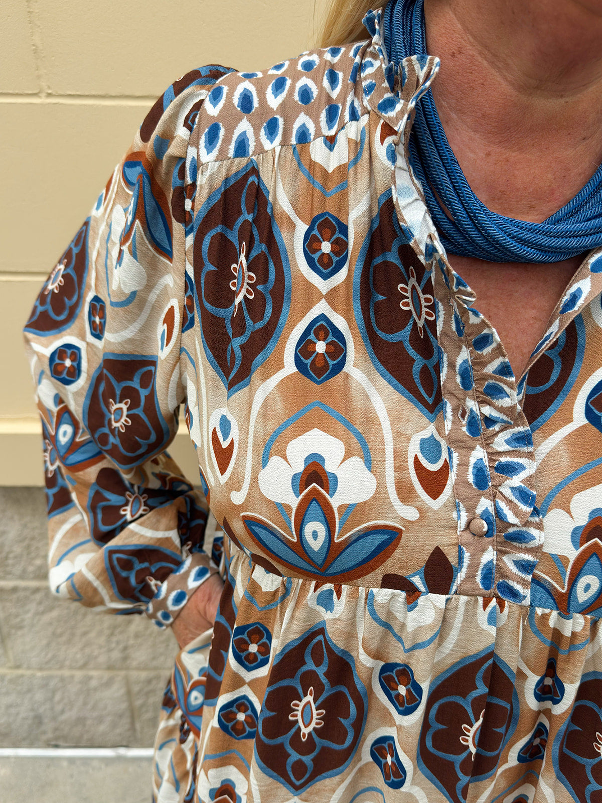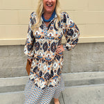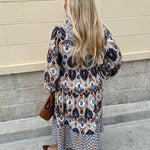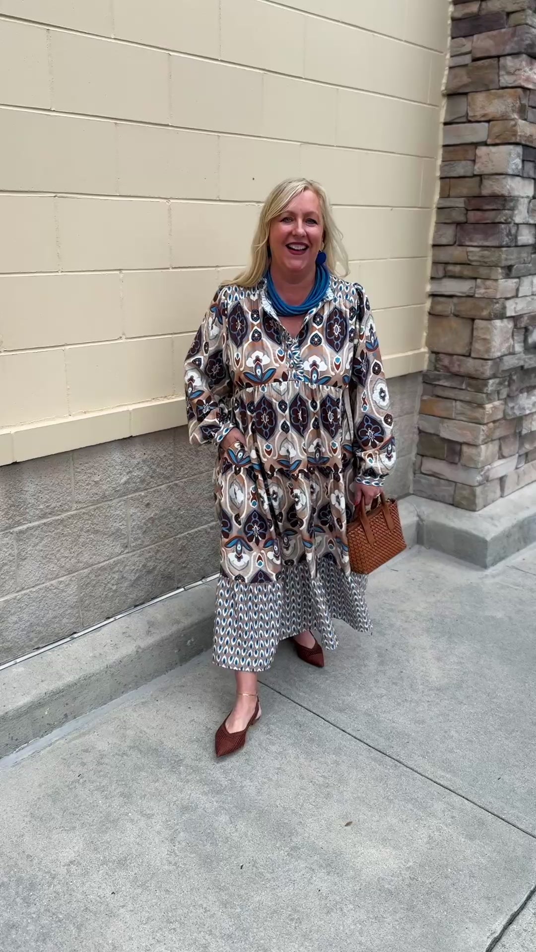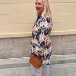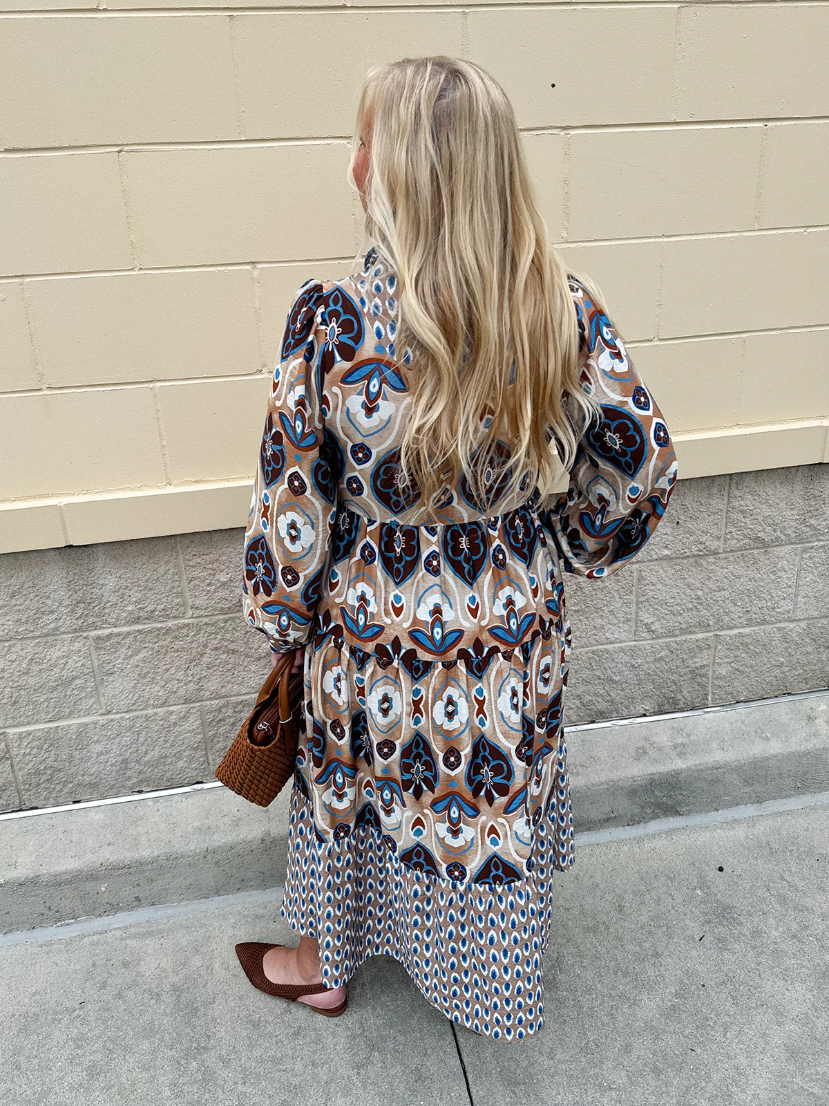 Craving a dress that feels like fall but wears like a dream? The Harvest Bloom Tiered Midi Dress captures everything we love about the season—warm hues, romantic details, and effortless movement. Designed in a beautiful mix of fall blues, creams, and browns, this dress blends soft prints with a flattering tiered silhouette that flows gracefully with every step.