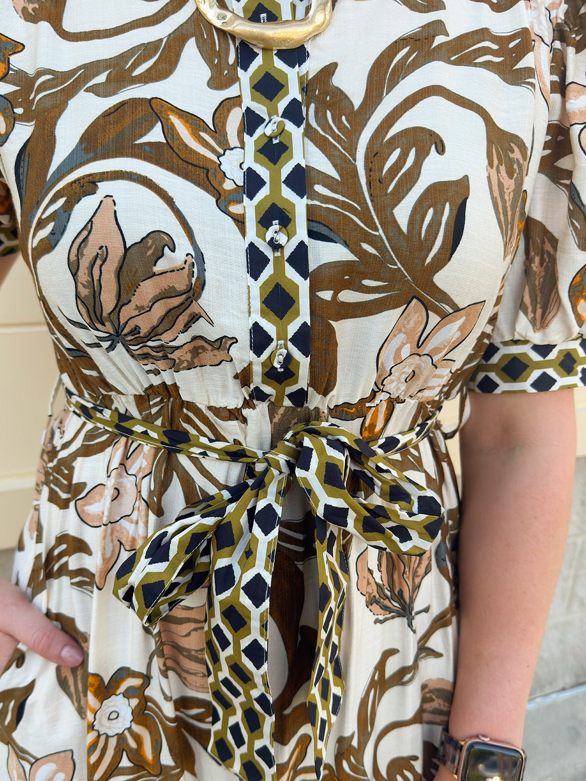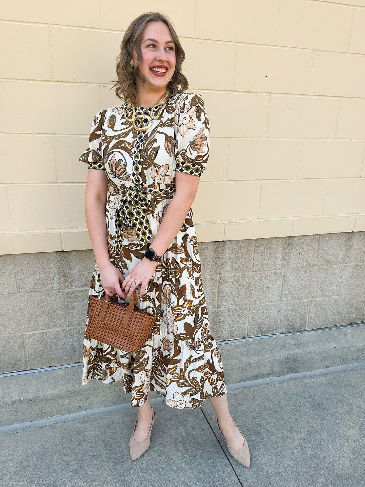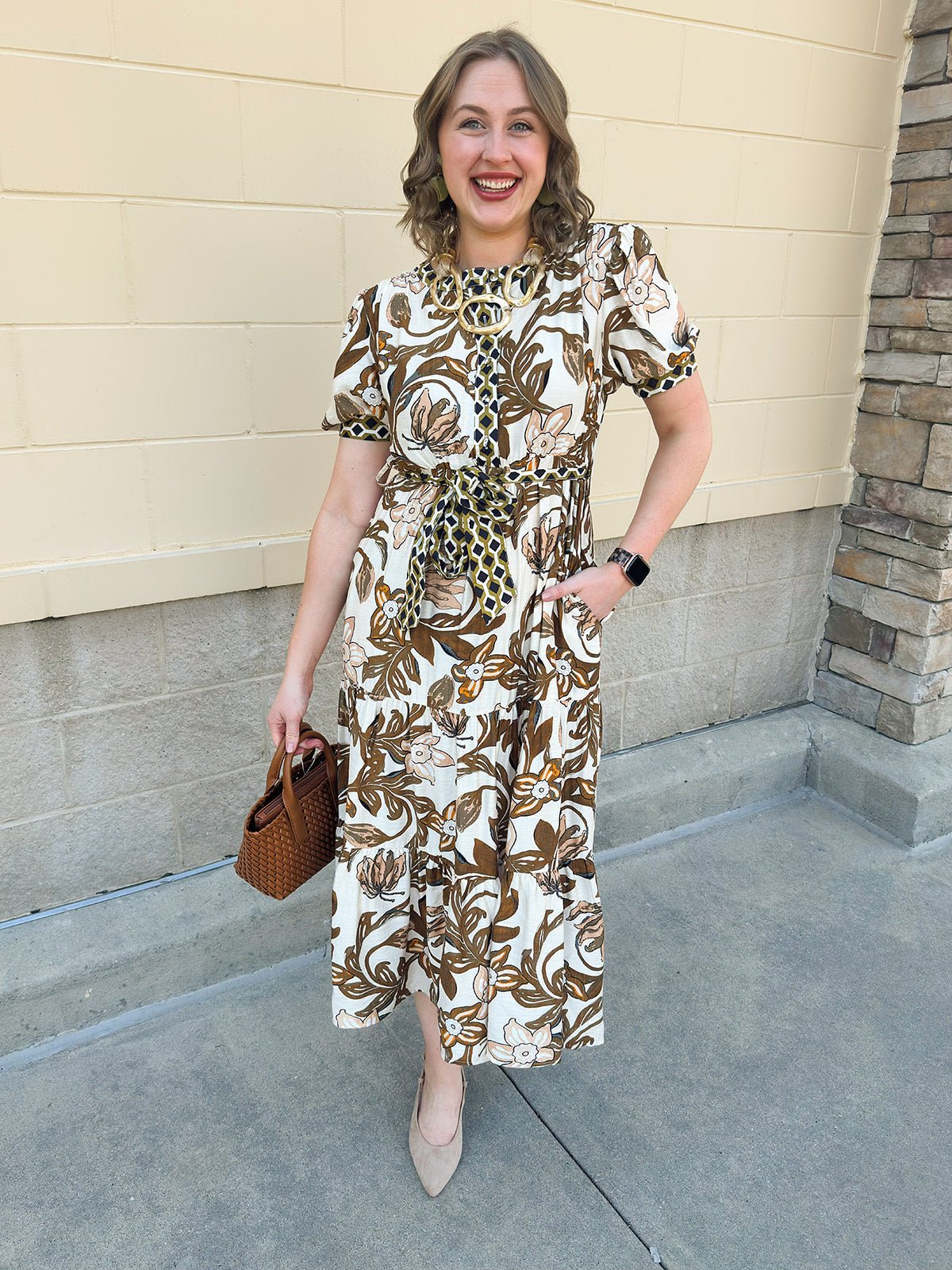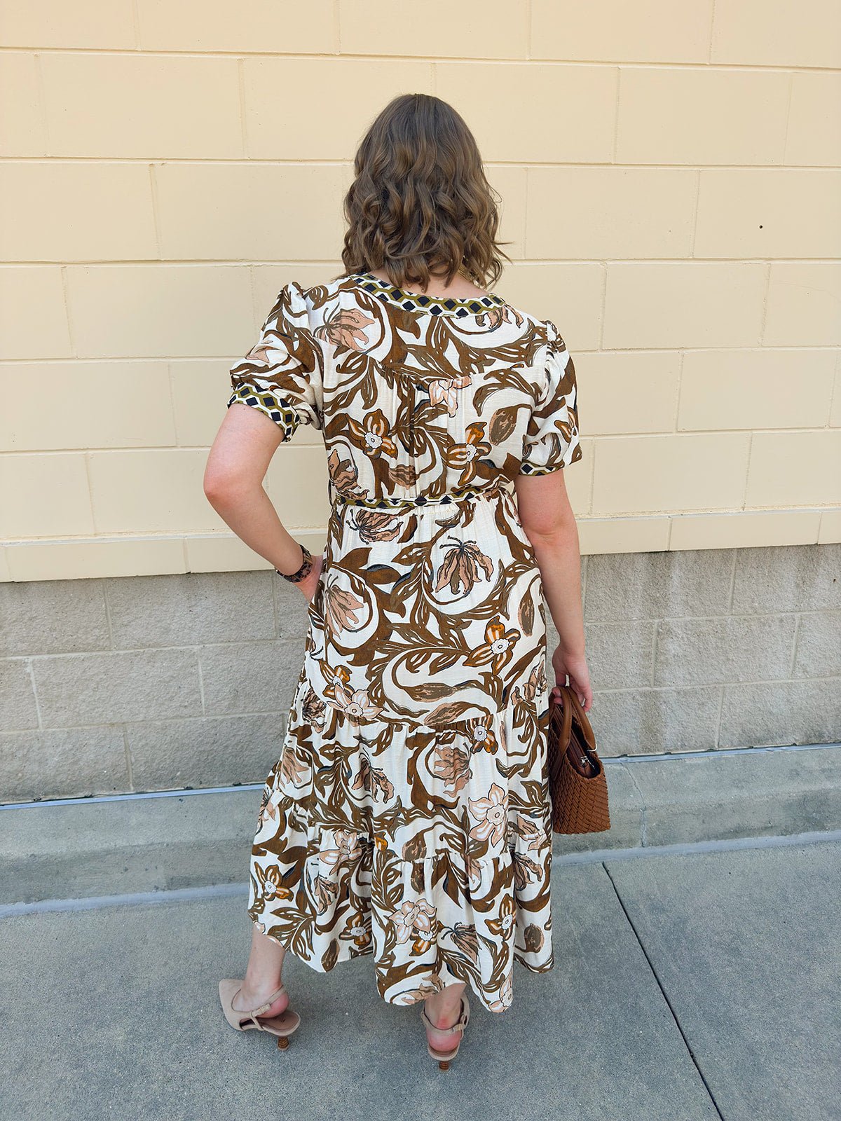 Tiered midi silhouette with floral print in brown, cream, and olive