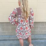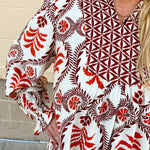 Looking for a dress that perfectly blends fall color and effortless charm? The Harvest Muse Printed Mini Dress captures the warm, inviting spirit of the season with its soft creams, rusts, and browns. Designed with a flattering V-neckline framed by a delicate ruffle collar, this mini dress features a smocked yoke and contrasting fabric detailing that add texture and visual depth to its feminine silhouette.